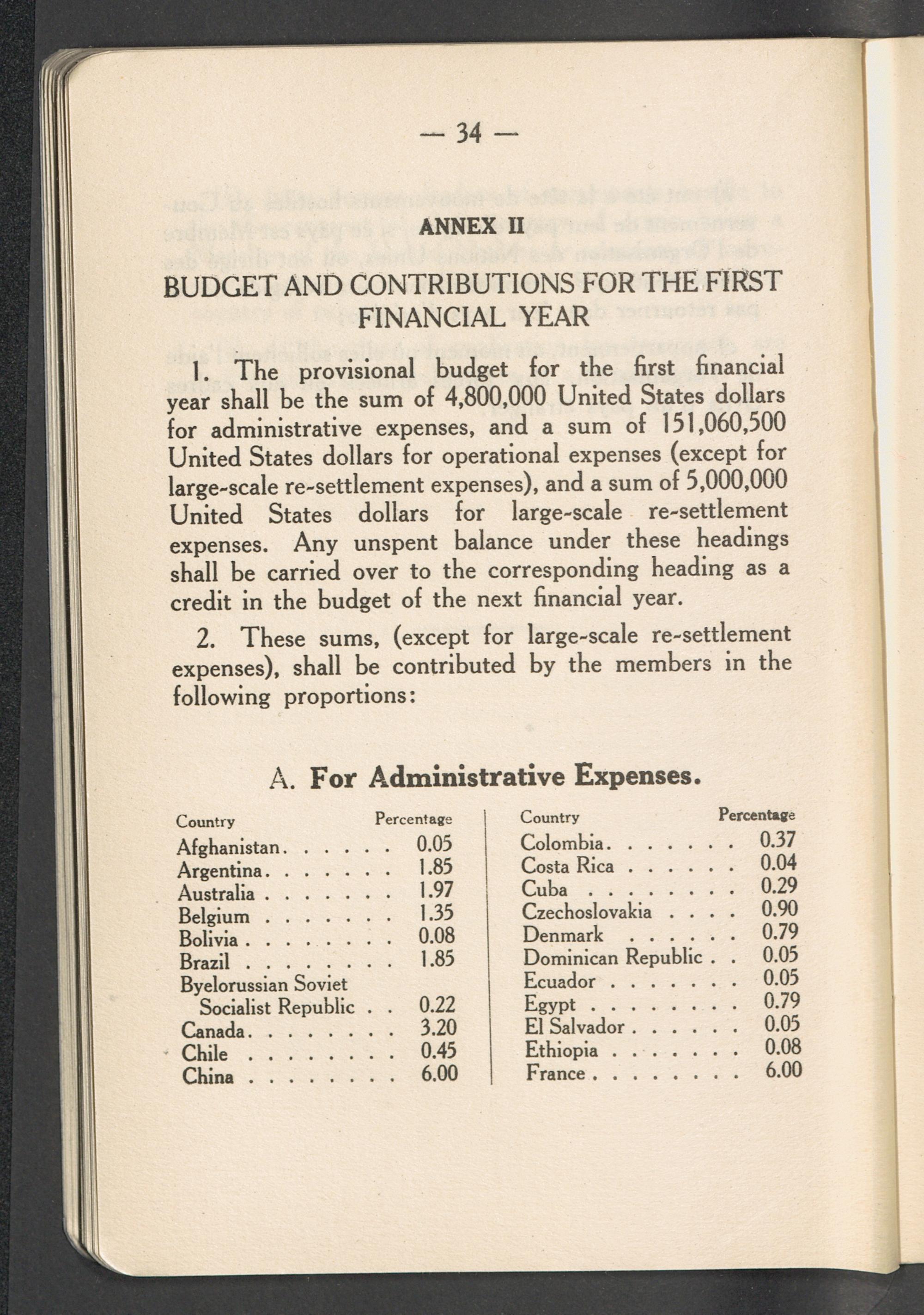 Constitution of the International Refugee Organization and agreement on interim measures... Annex II: Budget and Contributions for the First Financial Year