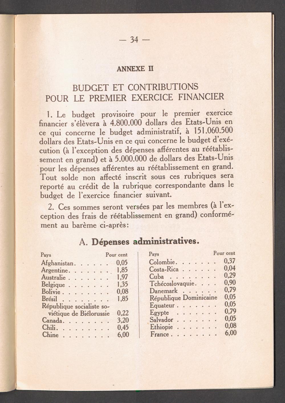 Constitution of the International Refugee Organization and agreement on interim measures... Annexe II: Budget et contributions pour le premier exercice financier