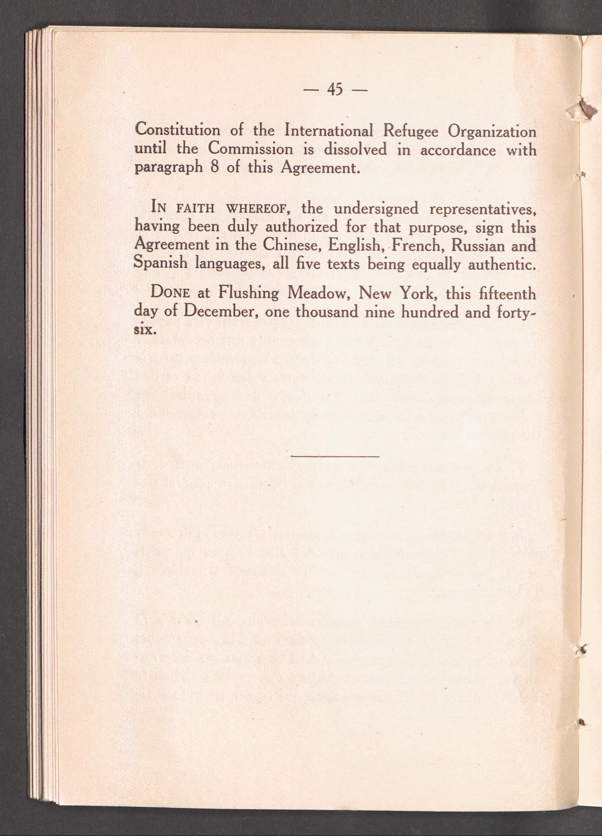 Constitution of the International Refugee Organization and agreement on interim measures / Constitution de l’organisation internationale pour les réfugiés et accord relatif aux dispositions provisoires / International Refugee Organization