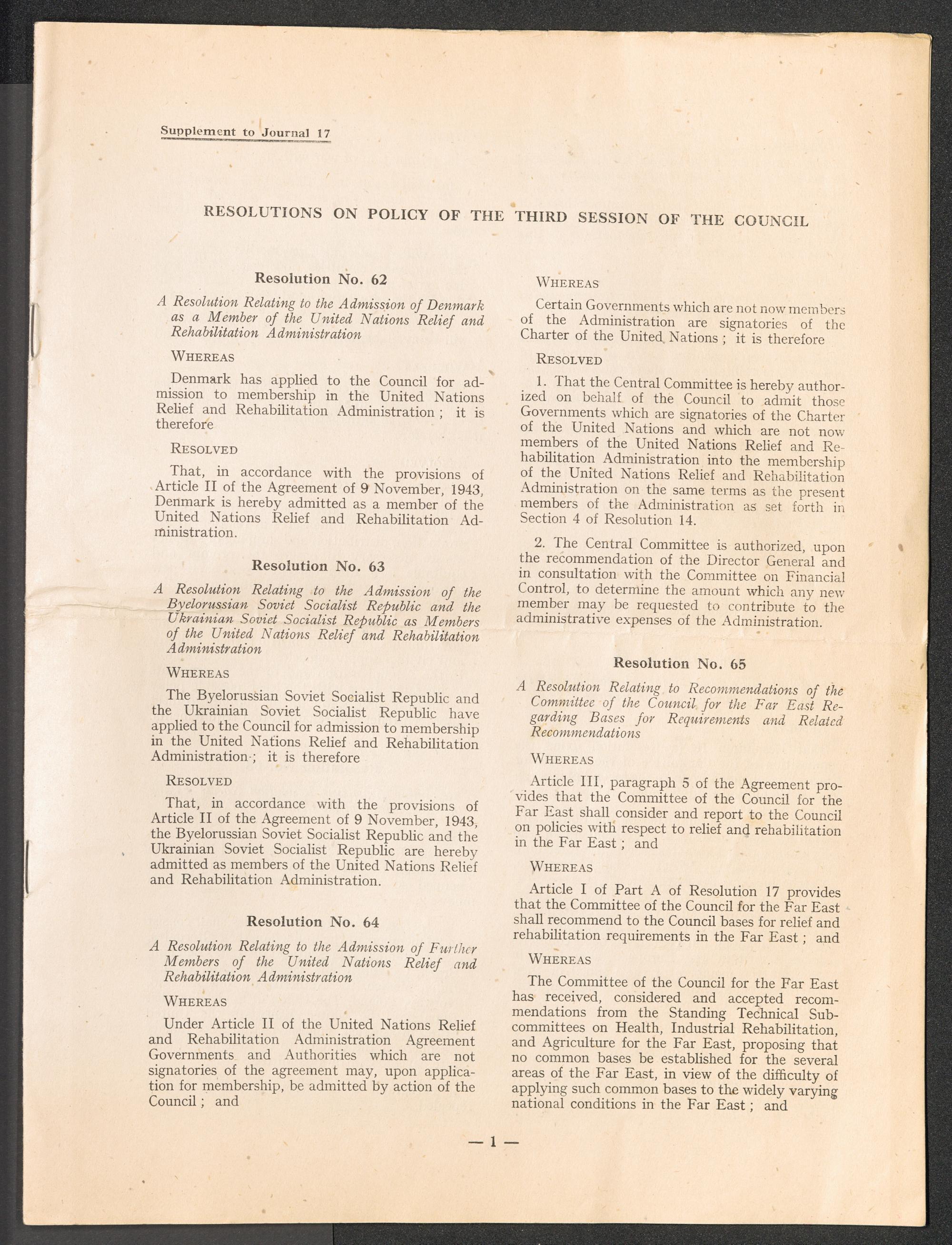 A compilation of the resolutions on policy, first and second sessions of the UNRRA Council / United Nations Relief and Rehabilitation Administration