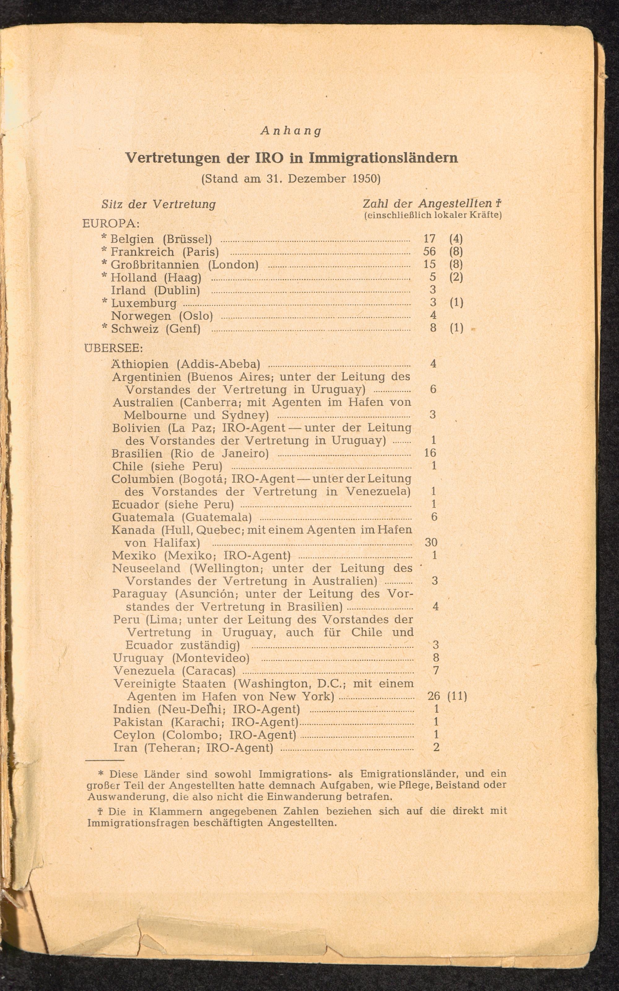Emigration aus Europa Anhang: Vertretungen der IRO in Immigrationsländern