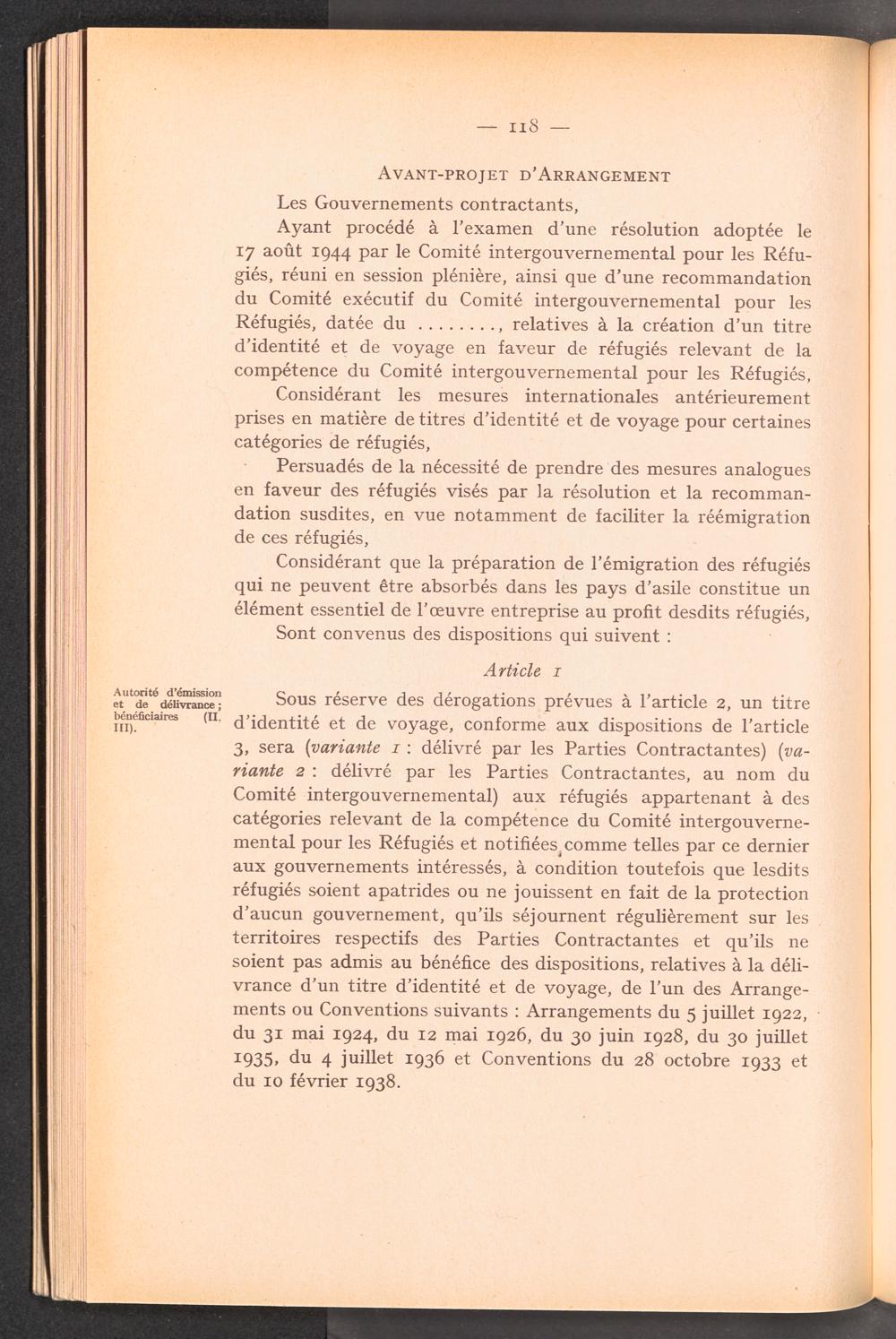 Documents préparatoires relatifs à l ' adoption d ' un titre d ' identité et de voyage pour des réfugiés relevant de la compétence du Comité Intergouvernemental / Intergovernmental Committee on Refugees
