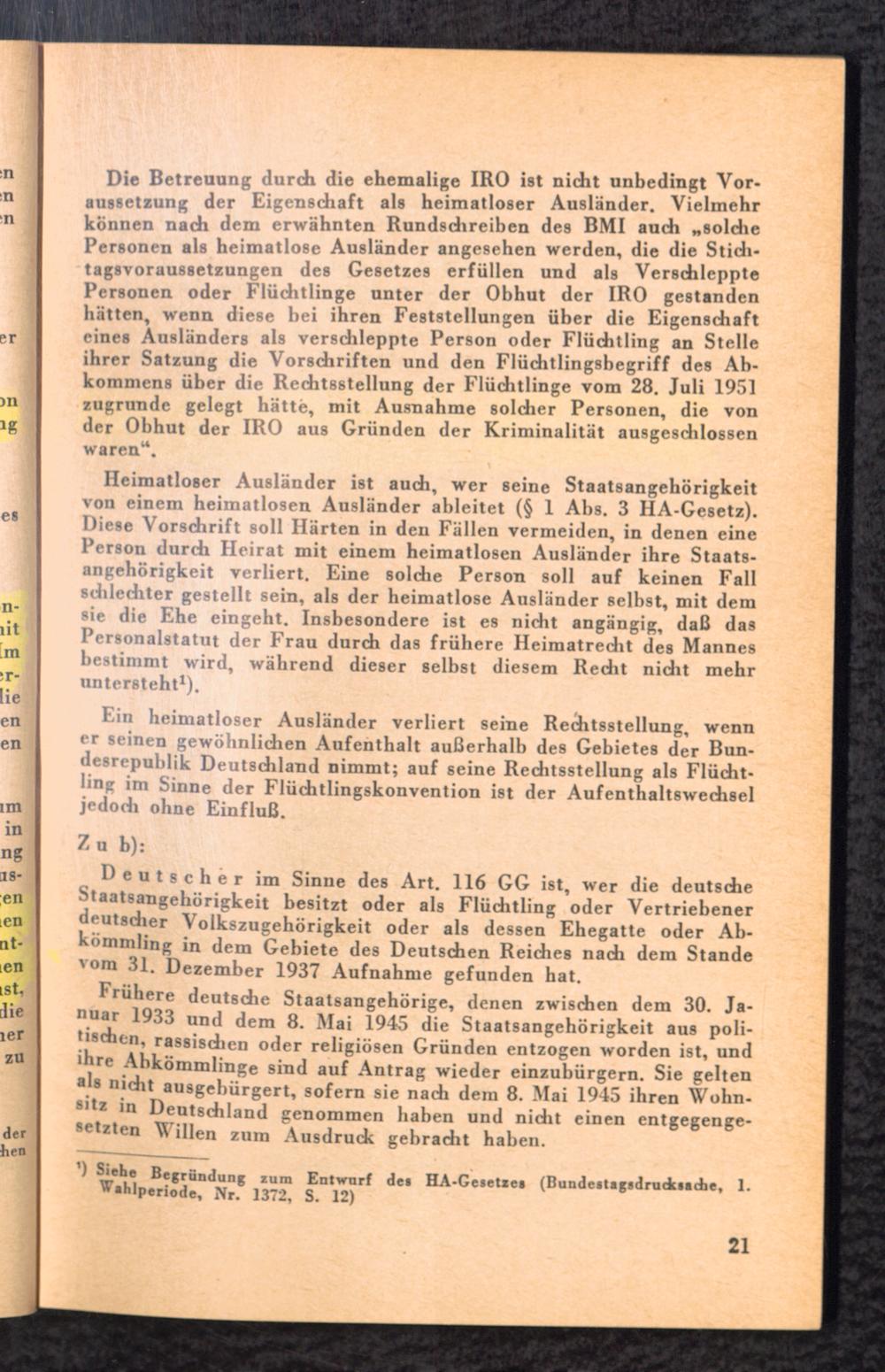 Der Ratgeber für heimatlose Ausländer und sonstige ausländische Flüchtlinge : Rechte und Pflichten nach der Internationalen Konvention über die Rechtsstellung der Flüchtlinge vom 28. Juli 1951 und dem Gesetz über die Rechtsstellung heimatloser Ausländer im Bundesgebiet vom 25. April 1951 / Bundesminister für Vertriebene, Flüchtlinge und Kriegsgeschädigte