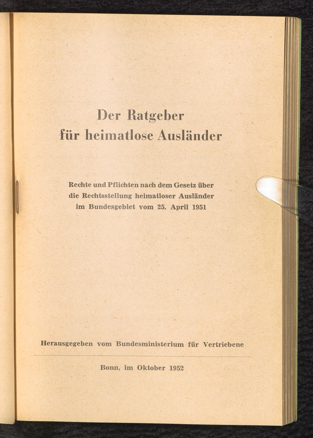 Der Ratgeber für heimatlose Ausländer und sonstige ausländische Flüchtlinge : Rechte und Pflichten nach dem Gesetz über die Rechtsstellung heimatloser Ausländer im Bundesgebiet vom 25. April 1951 / Bundesminister für Vertriebene, Flüchtlinge und Kriegsgeschädigte