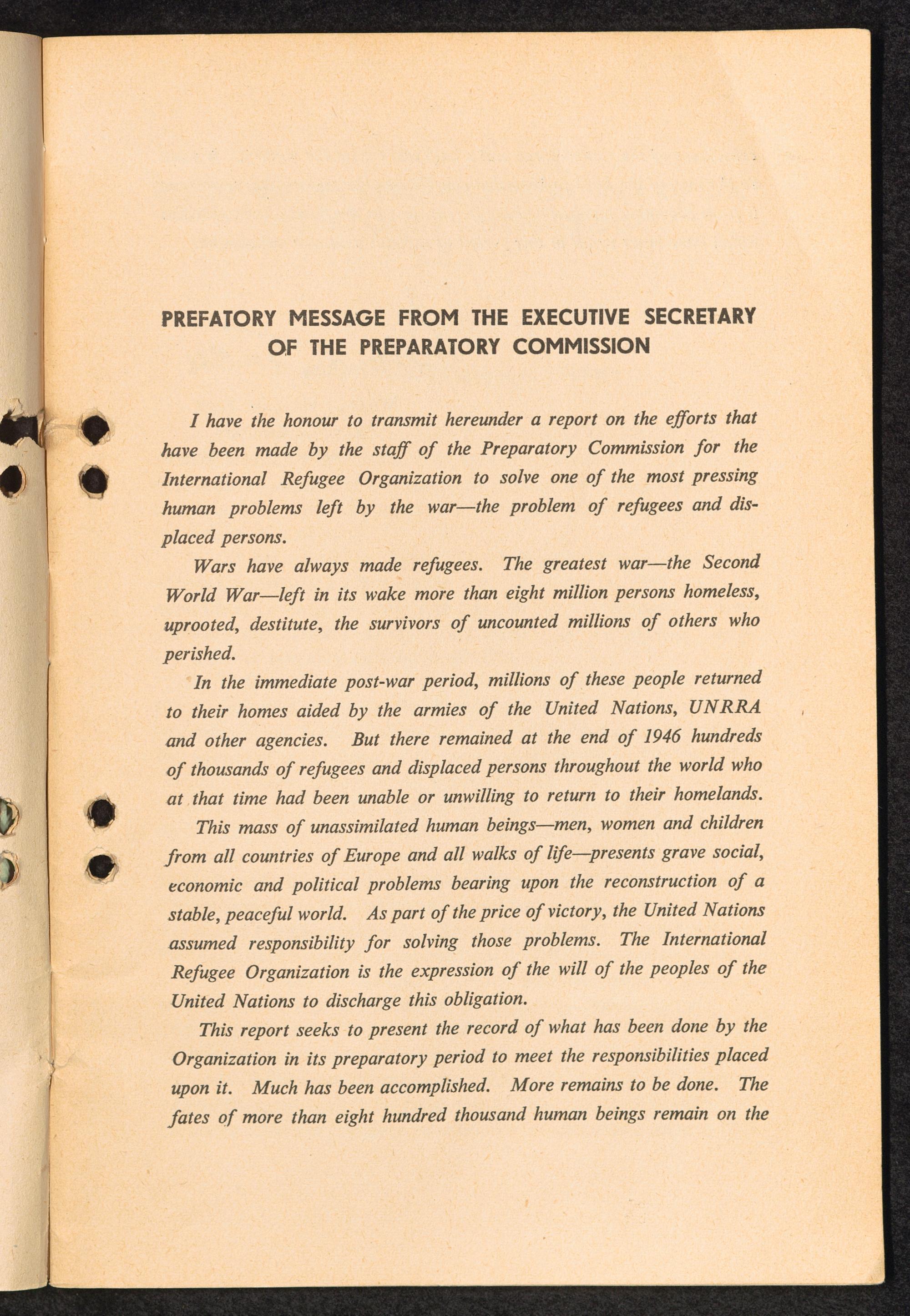 Report to the General Council of the International Refugee Organization by the Executive... Prefatory Message from the Executive Secretary of the Preparatory Commission