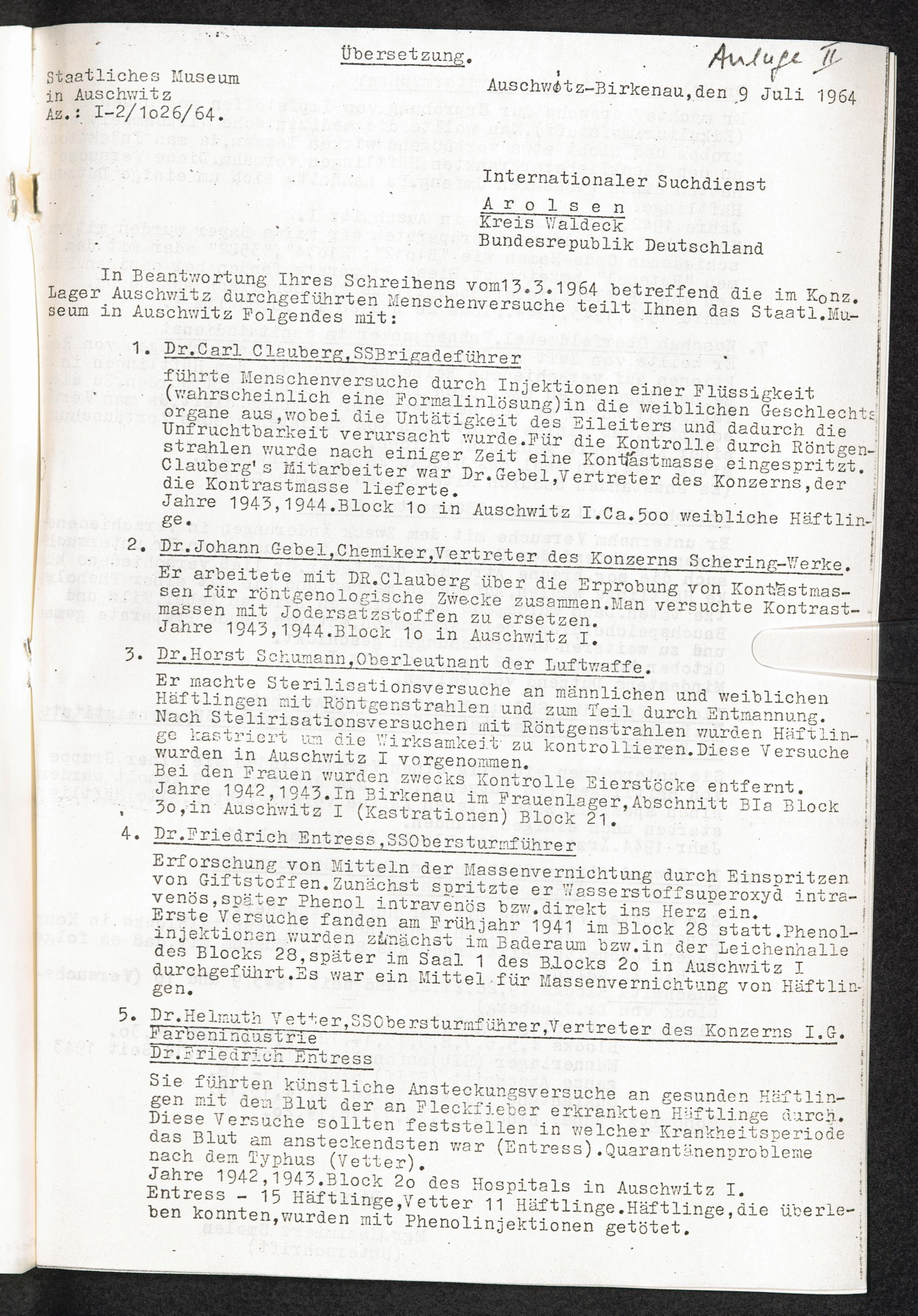 Pseudo-medizinische Versuche im KL Auschwitz : Versuche mit Brandwunden / Internationaler Suchdienst