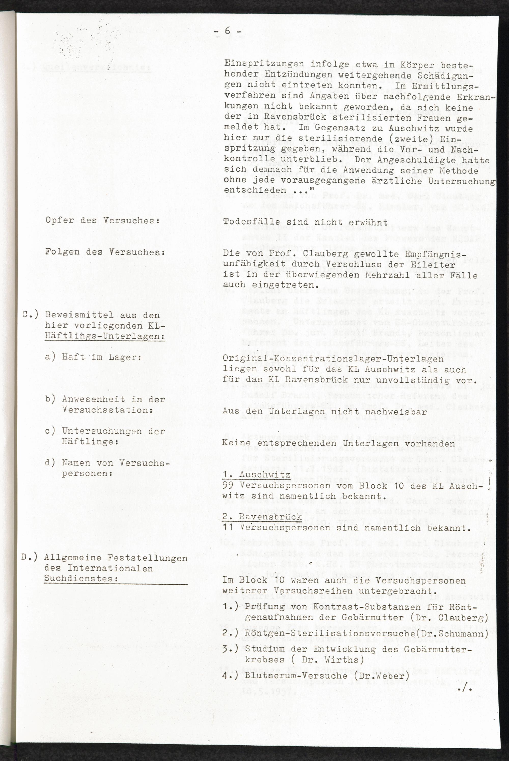 Pseudo-medizinische Versuche im KL Auschwitz und KL Ravensbrück : Sterilisationsversuche an Frauen durch intrauterine Einspritzungen / Internationaler Suchdienst