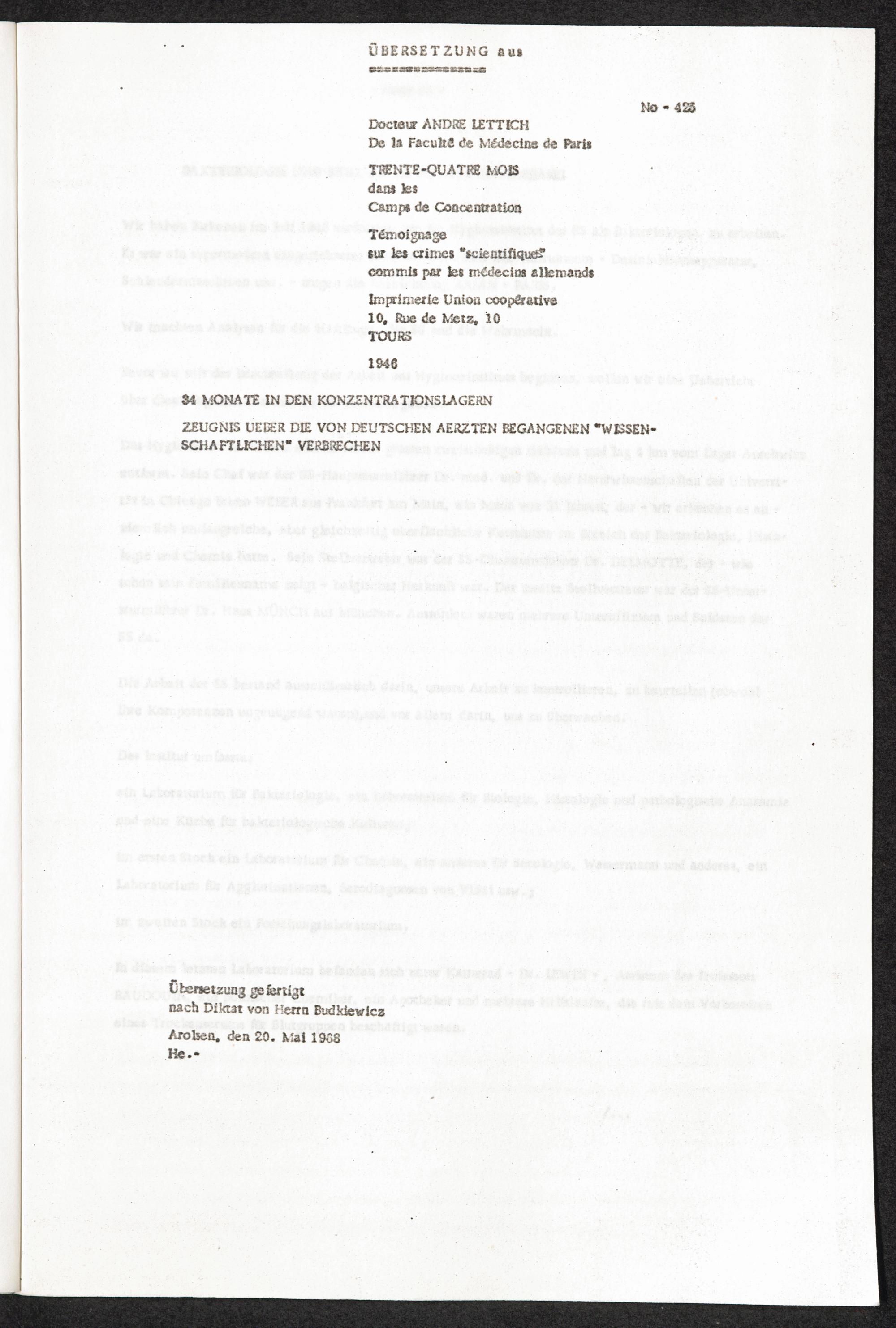 Pseudo-medizinische Versuche im KL Auschwitz : These über Veränderung des Magensaftes bei Typhus exanthematicus / Internationaler Suchdienst