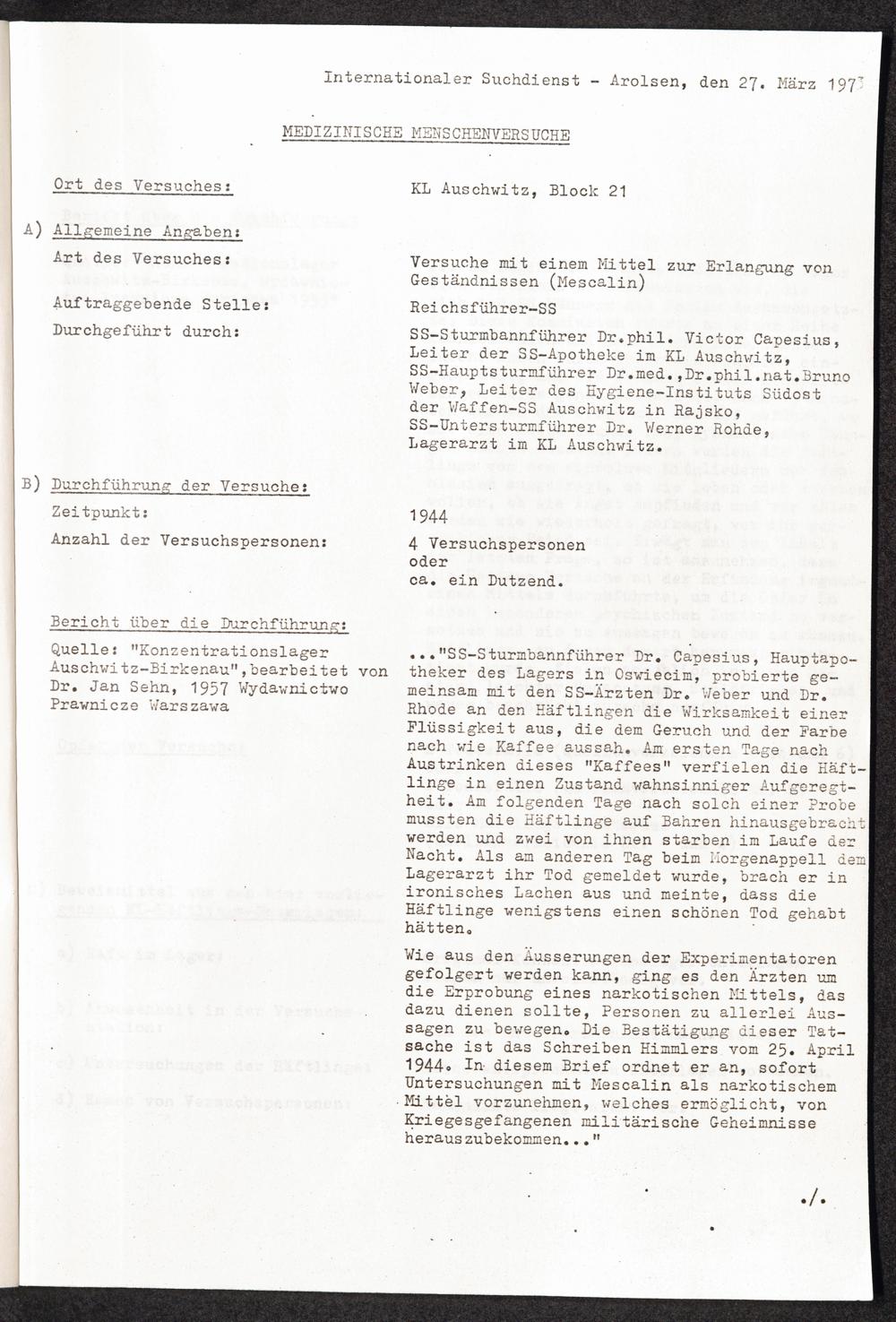 Pseudo-medizinische Versuche im KL Auschwitz : Versuche mit einem Mittel zur Erlangung von Geständnissen (Mescalin) / Internationaler Suchdienst (ITS)