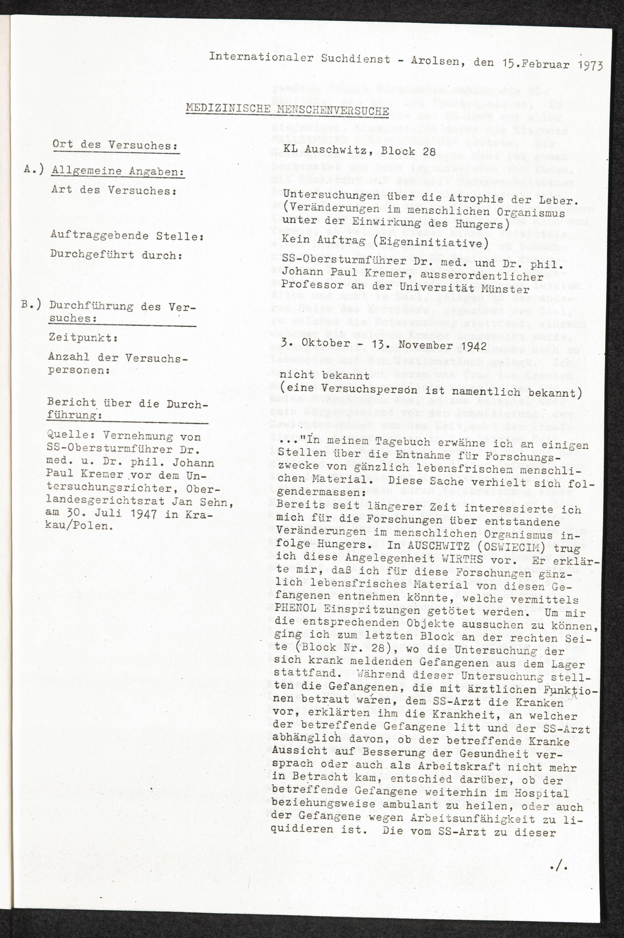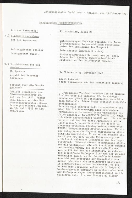 Pseudo-medizinische Versuche im KL Auschwitz : Untersuchungen über die Atrophie der Leber / Internationaler Suchdienst
