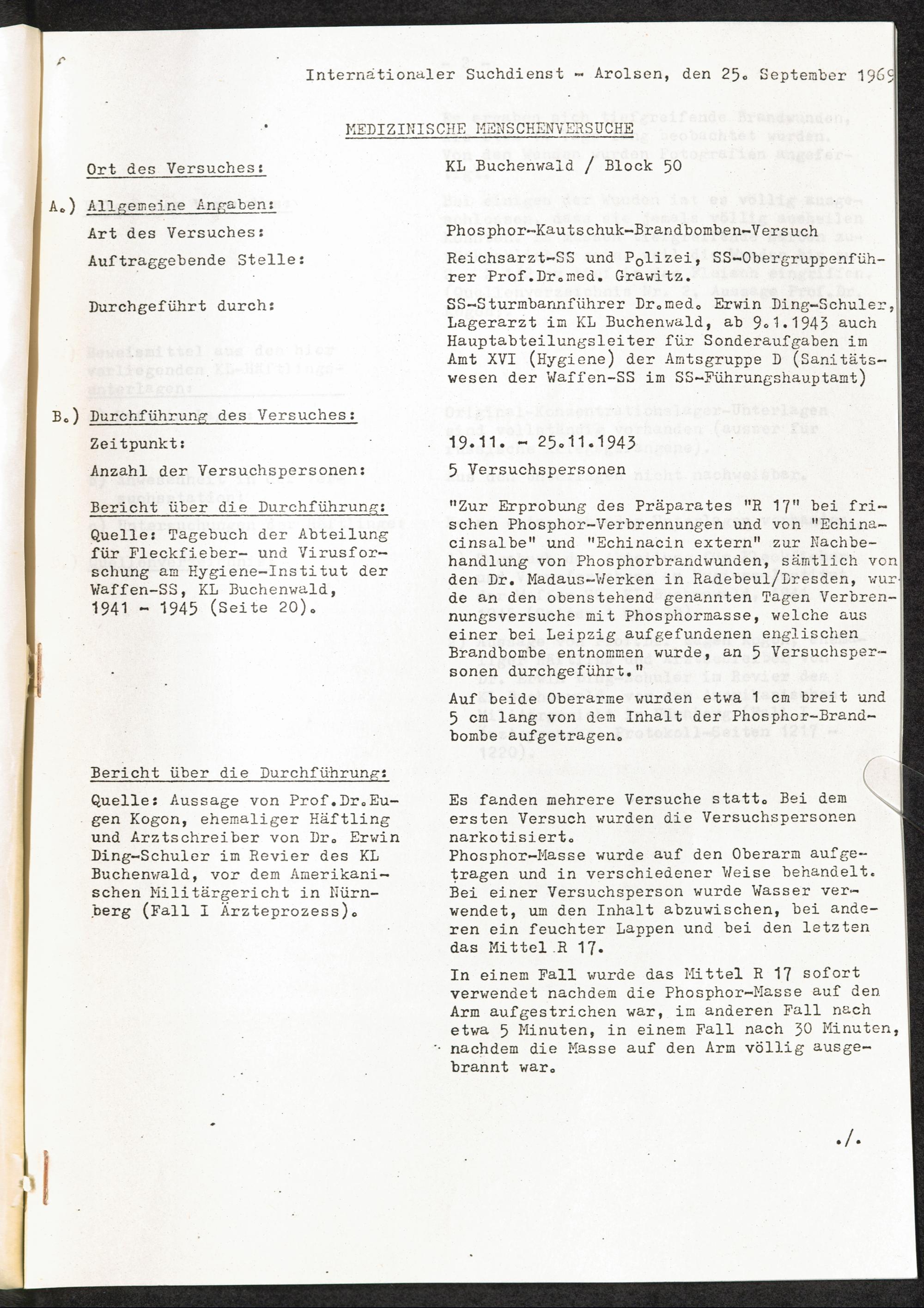 Pseudo-medizinische Versuche im KL Buchenwald : Phosphor-Kautschuk-Brandbomben-Versuch / Internationaler Suchdienst