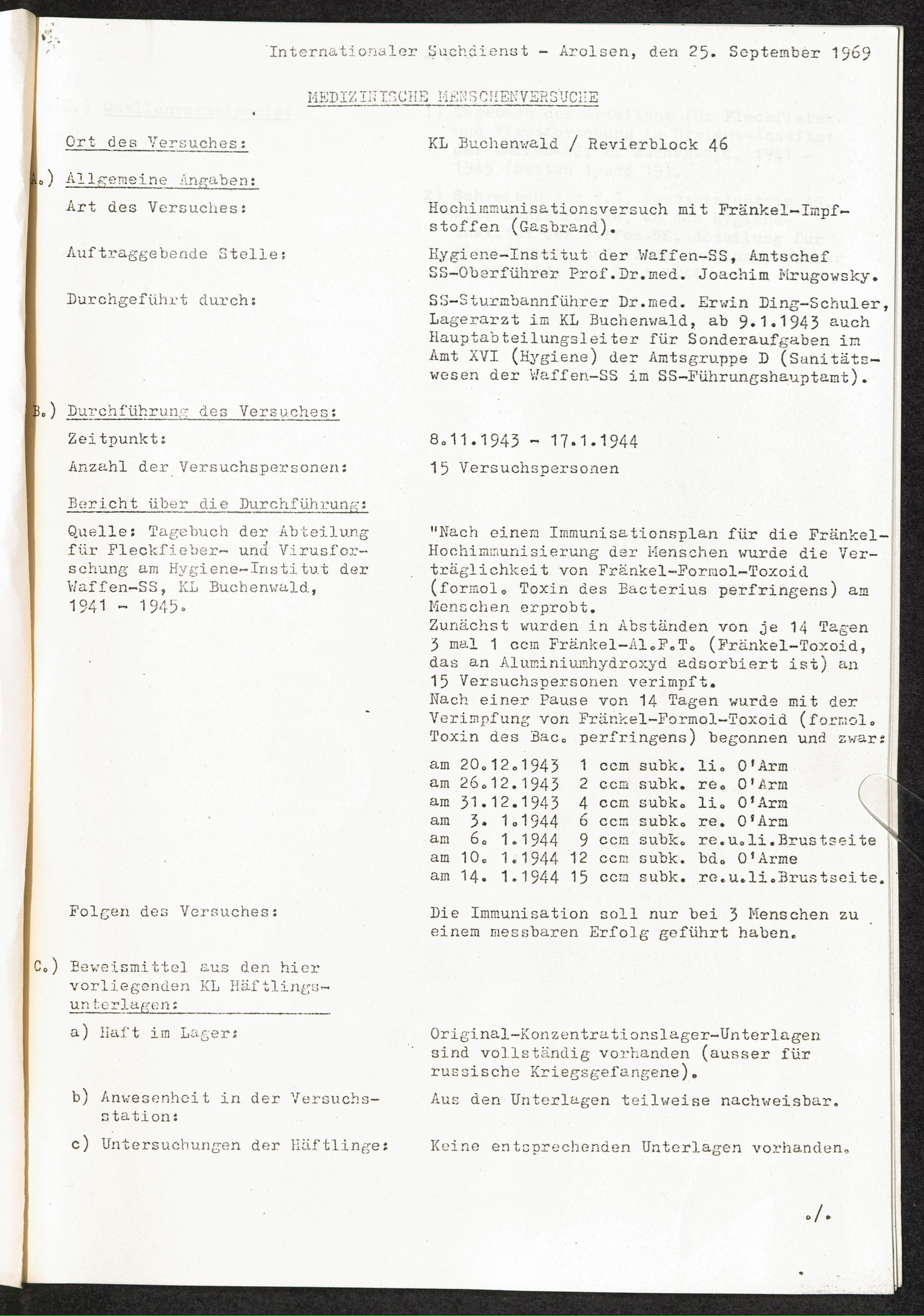 Pseudo-medizinische Versuche im KL Buchenwald : Hochimmunisationsversuch mit Fränkel-Impfstoffen (Gasbrand) / Internationaler Suchdienst (ITS)