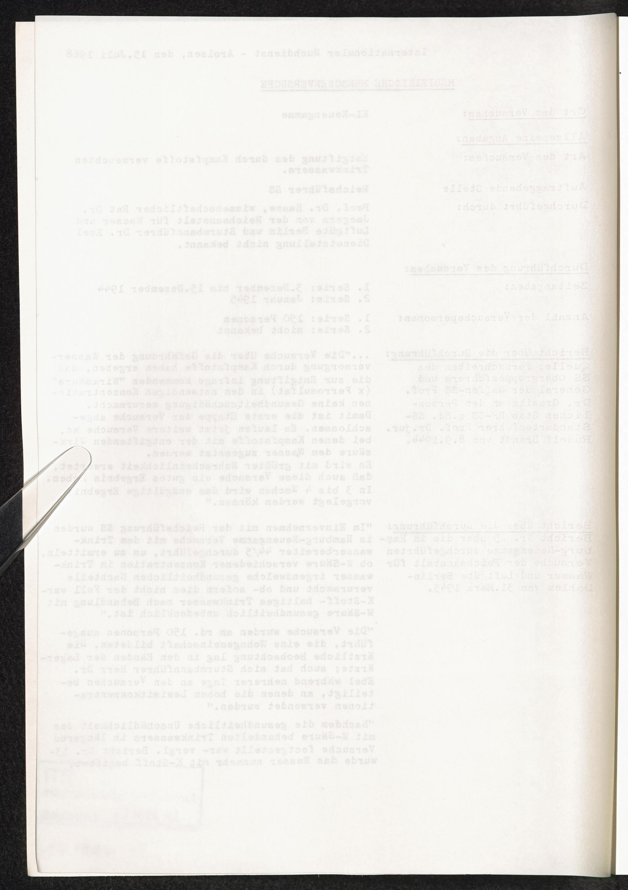 Pseudo-medizinische Versuche im KL Neuengamme : Entgiftung des durch Kampfstoffe verseuchten Trinkwassers / Internationaler Suchdienst