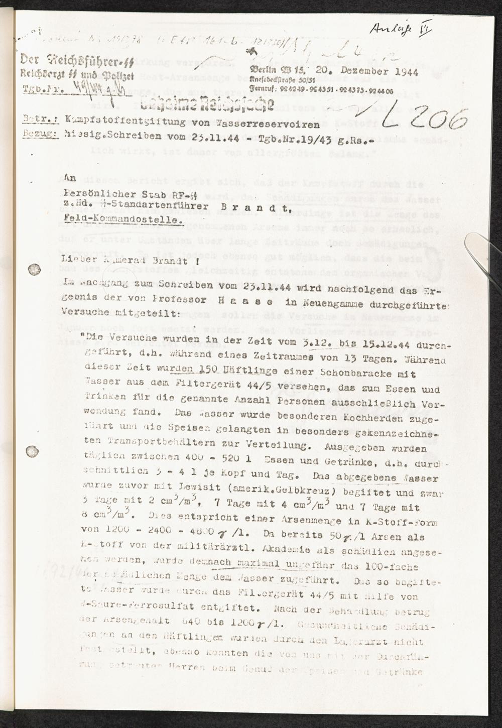 Pseudo-medizinische Versuche im KL Neuengamme : Entgiftung des durch Kampfstoffe verseuchten Trinkwassers / Internationaler Suchdienst