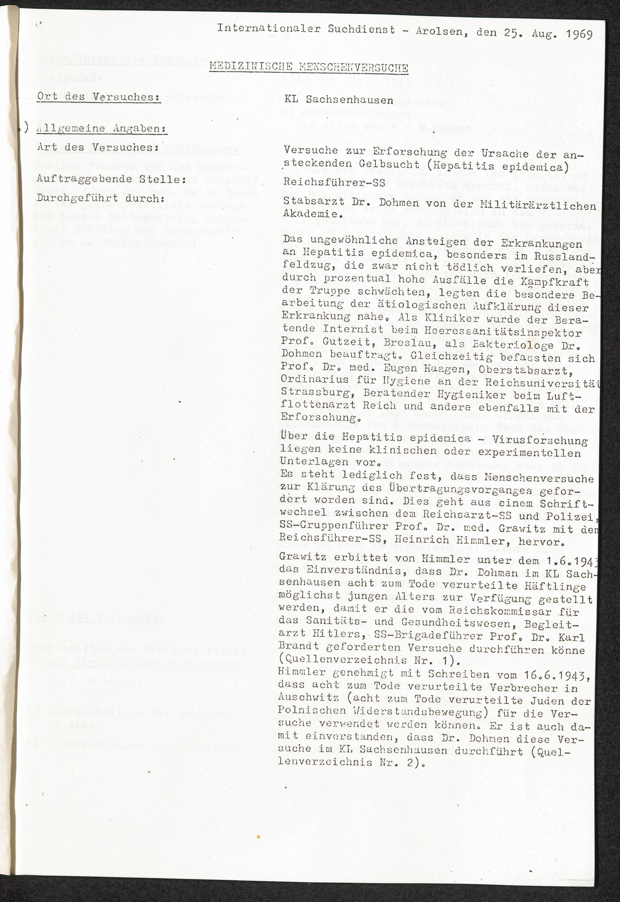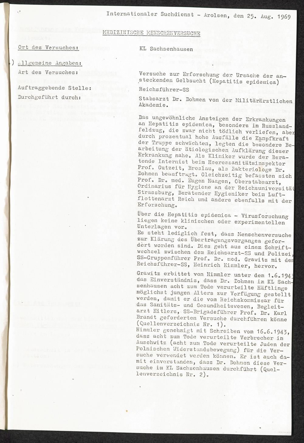 Pseudo-medizinische Versuche im KL Sachsenhausen : Versuche zur Erforschung der Ursache der ansteckenden Gelbsucht (Hepatitis epidemica) / Internationaler Suchdienst (ITS)