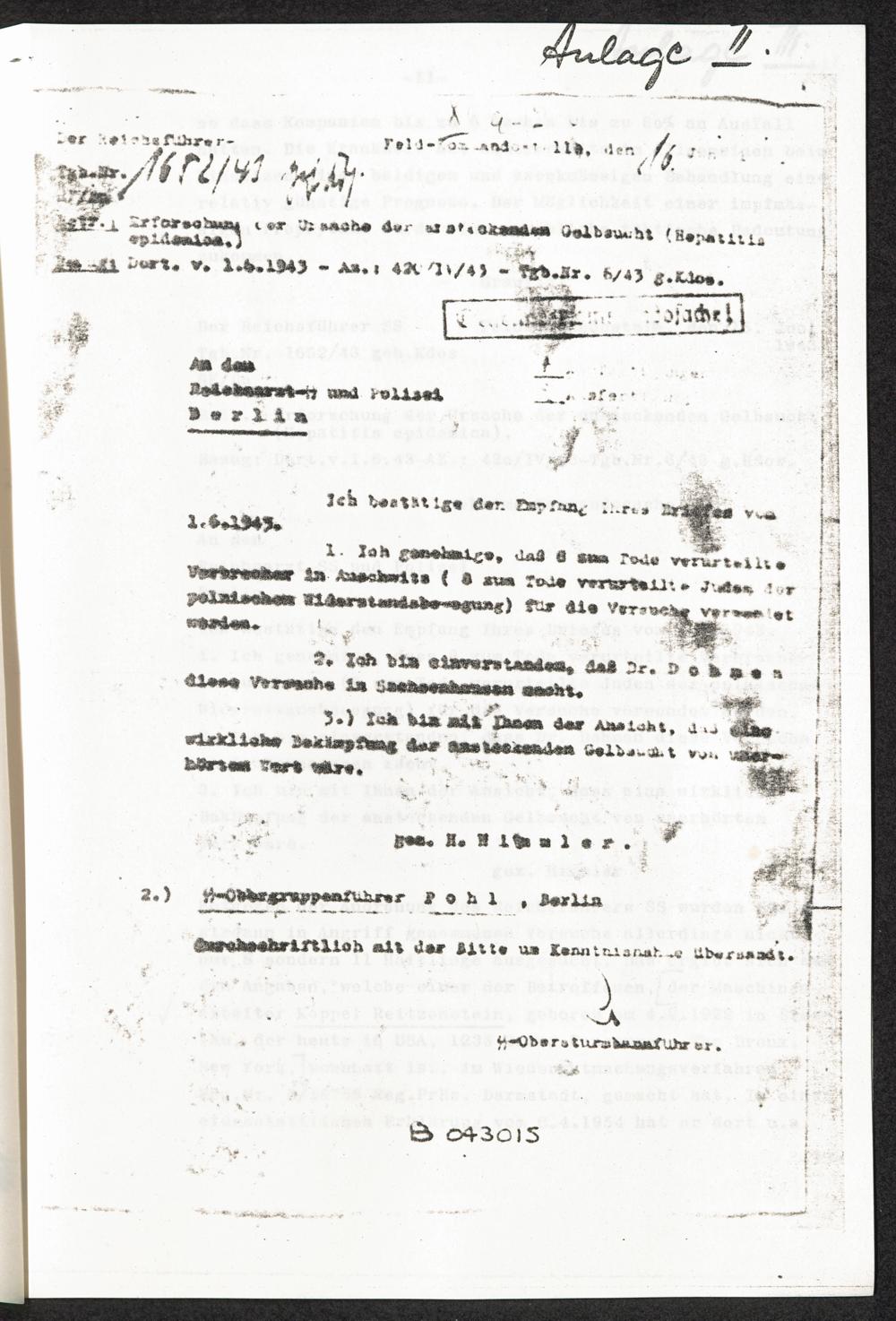 Pseudo-medizinische Versuche im KL Sachsenhausen : Versuche zur Erforschung der Ursache der ansteckenden Gelbsucht (Hepatitis epidemica) / Internationaler Suchdienst (ITS)