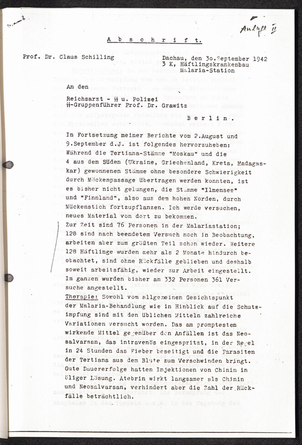 Pseudo-medizinische Versuche im KL Dachau Anlage II: Abschrift.