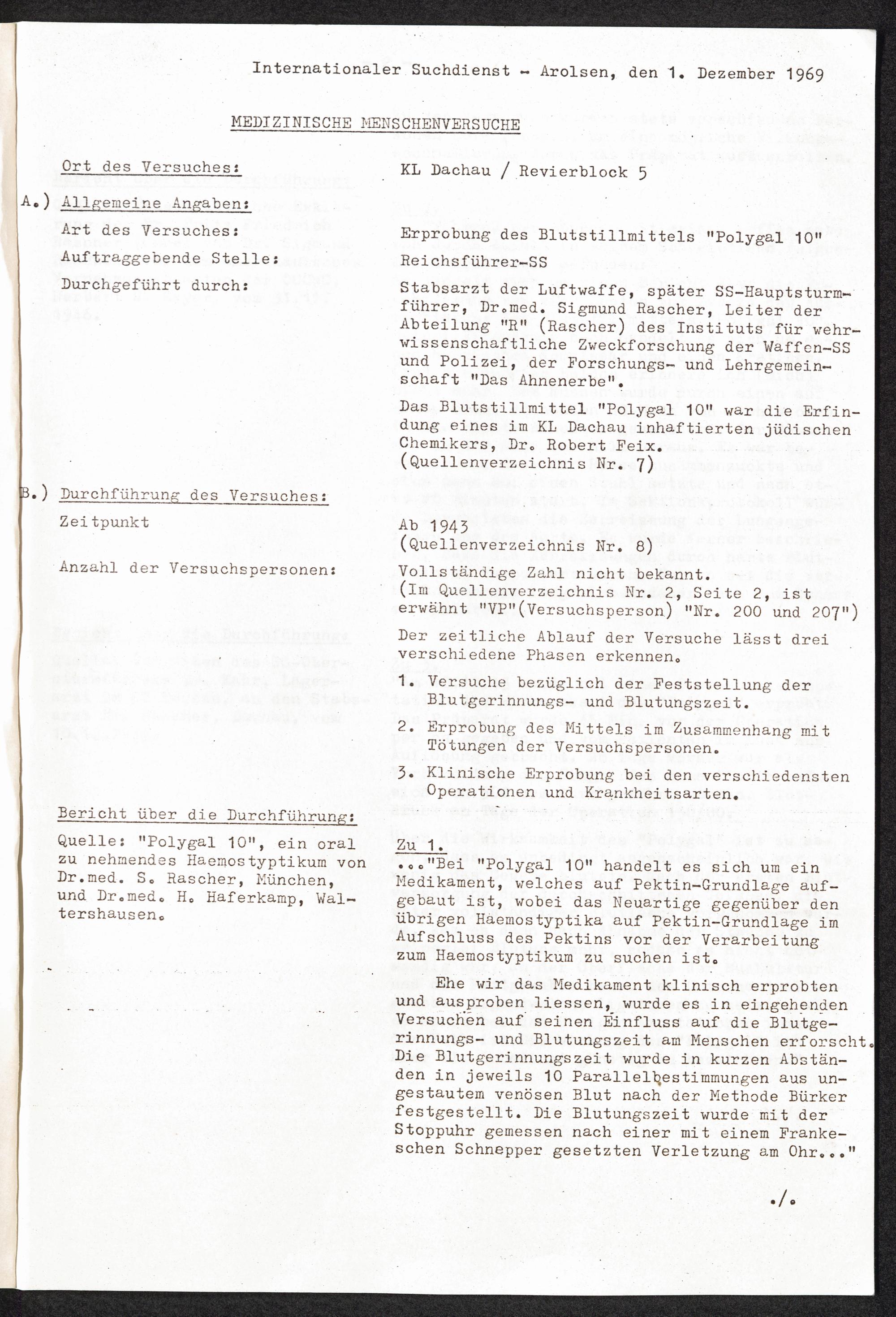 Pseudo-medizinische Versuche im KL Dachau : Erprobung des Blutstillmittels "Polygal 10" / Internationaler Suchdienst