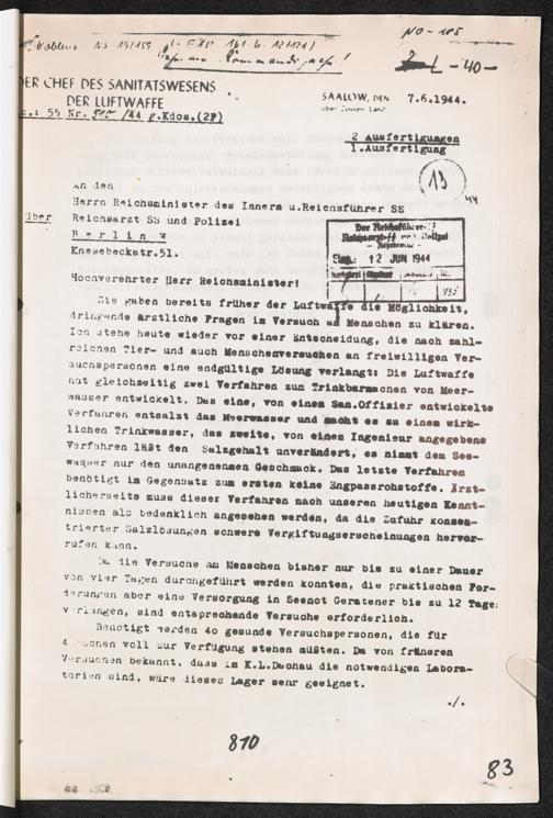 Pseudo-medizinische Versuche im KL Dachau : Versuche zur Trinkbarmachung von Meerwasser / Internationaler Suchdienst