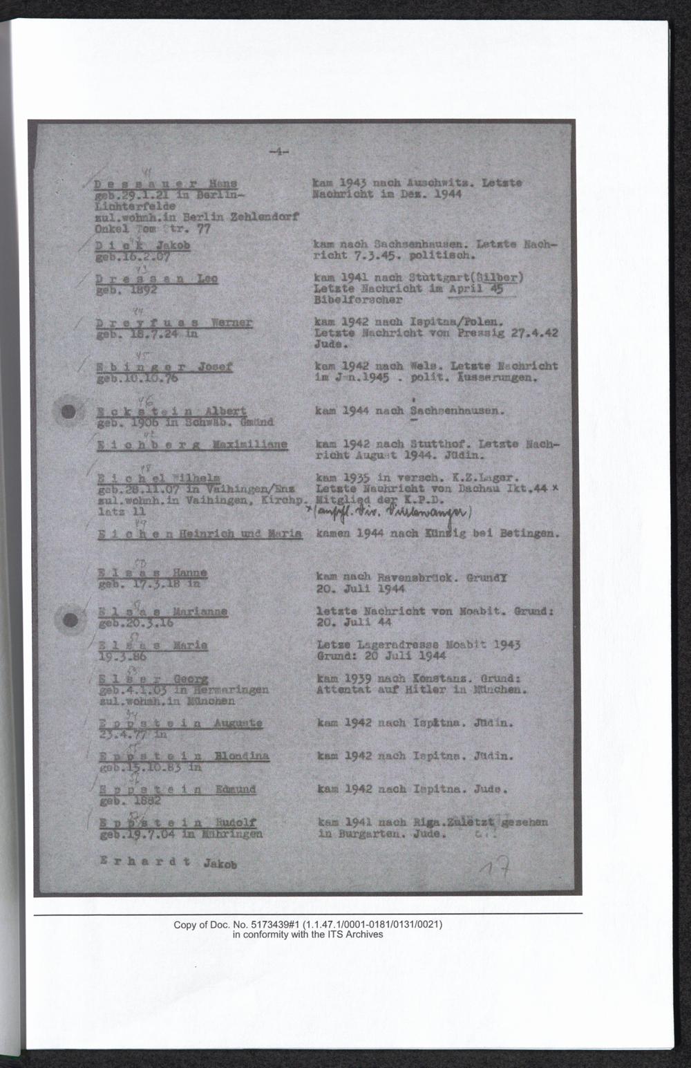 Auswahlbibliografie zu Georg Elser / International Tracing Service