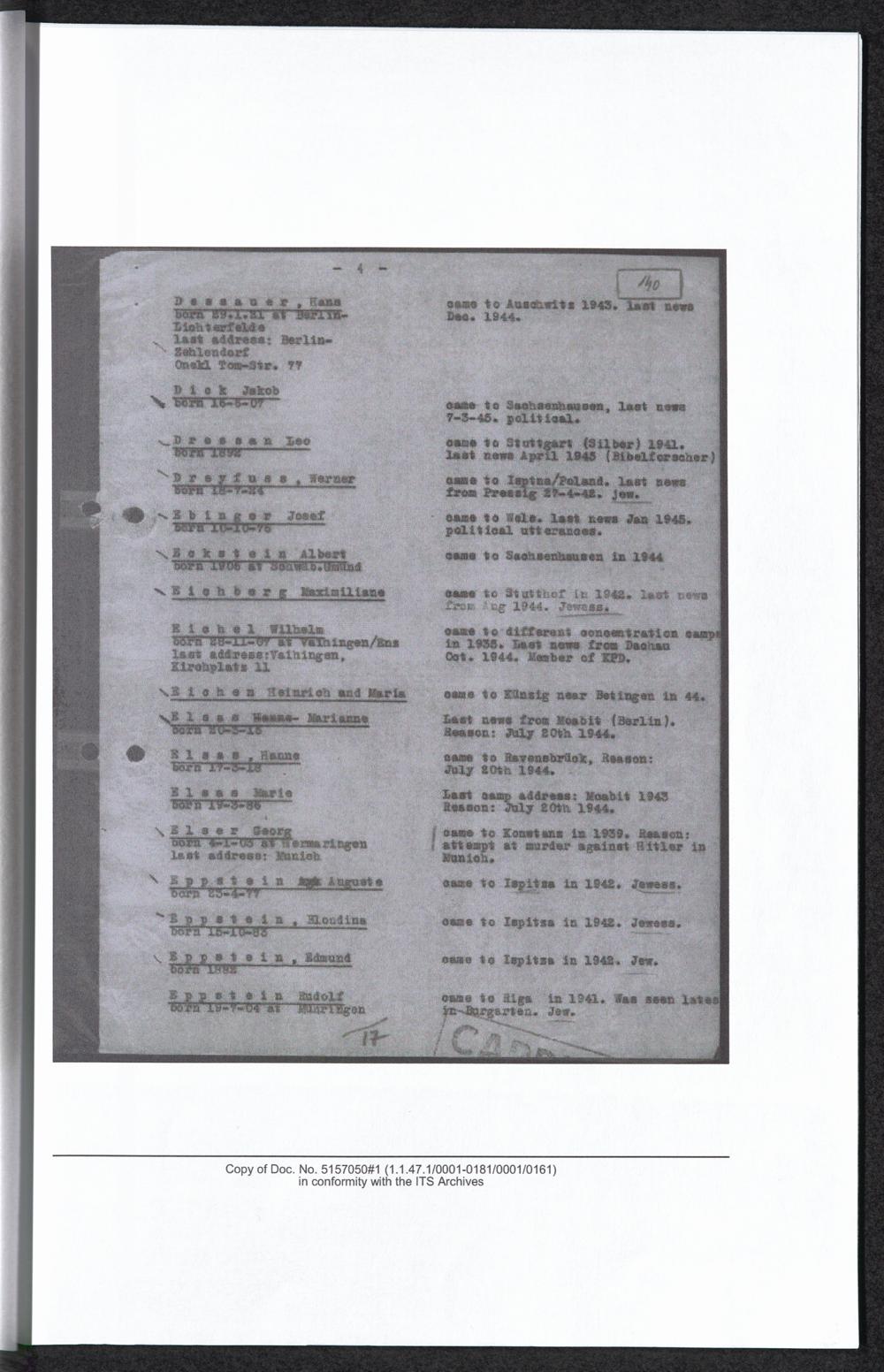 Auswahlbibliografie zu Georg Elser / International Tracing Service