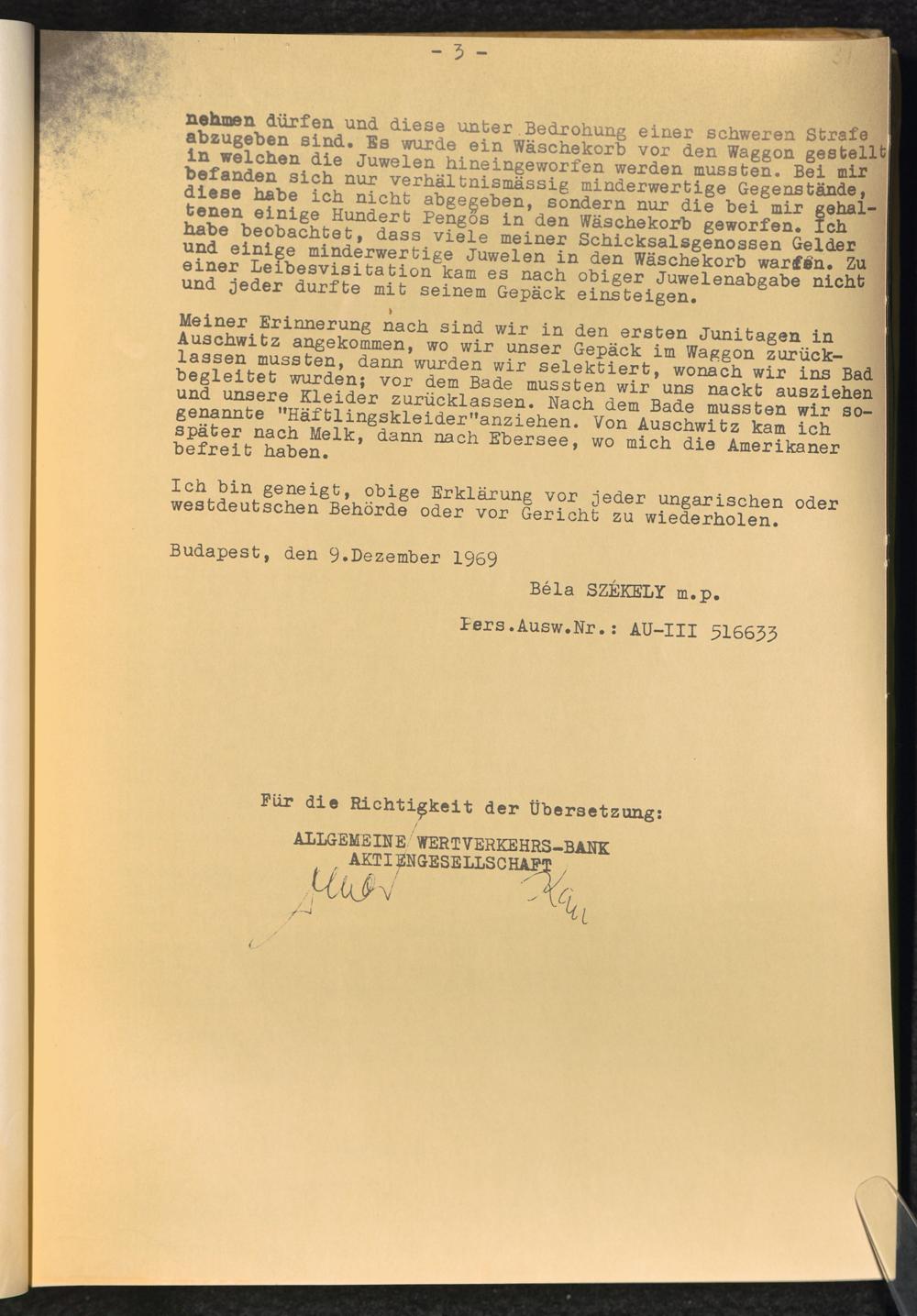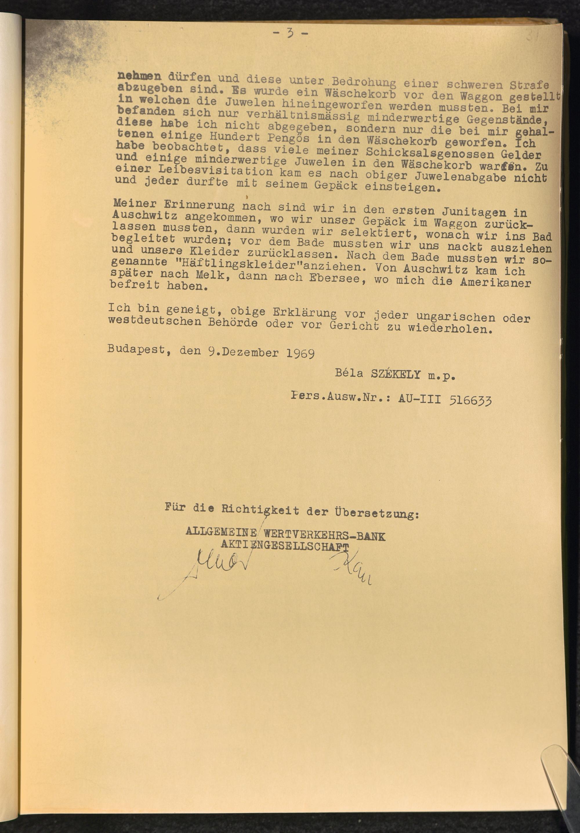 Entziehung der Wertgegenstände ungarischer Verfolgter in den KZ-Lagern : Erwiderung auf die Entscheidung des Kammergerichtes Berlin, 18 W 2492/2493/67 vom 27.6.1969 / Allgemeine Wertverkehrs-Bank A.G.
