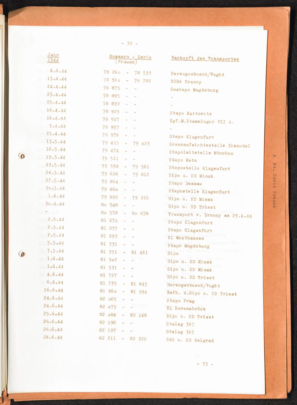 Häftlingsnummernzuteilungen Nummerbesetzung im Konzentrationslager Auschwitz. Frauen Jahr 1942 - 1944
