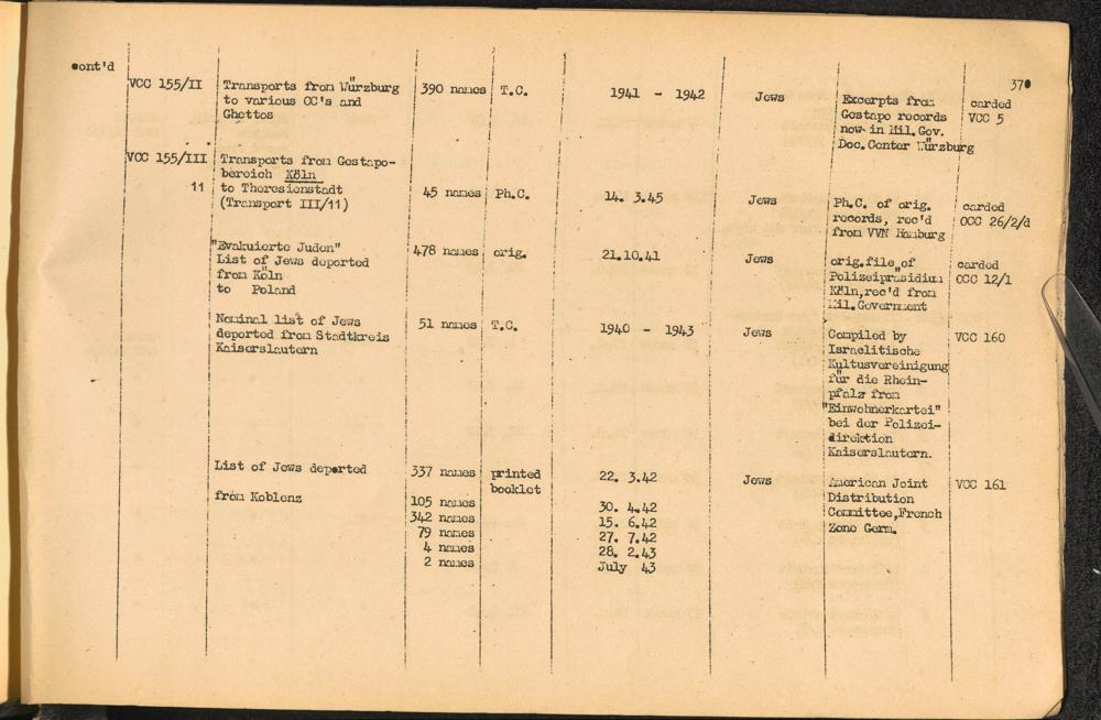 Band 2. Katalog der Konzentrationslager-Dokumente die sich bei dem International... Gestapo Transports of Jews from Germany to the East
