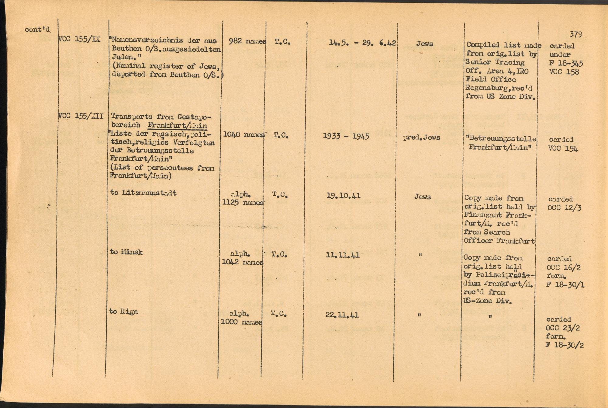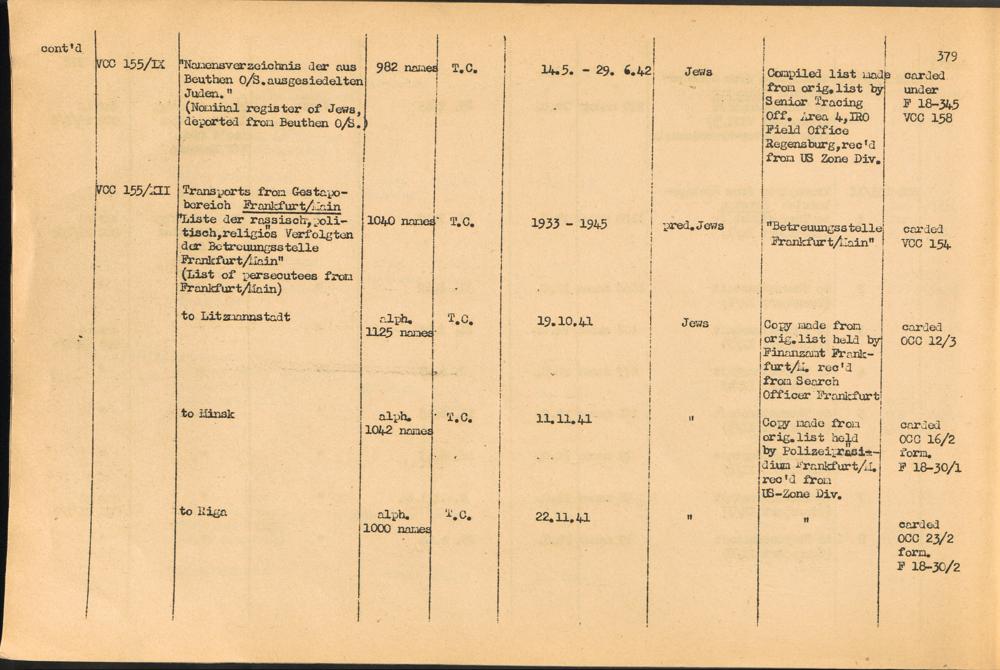 Band 2. Katalog der Konzentrationslager-Dokumente die sich bei dem International... Gestapo Transports of Jews from Germany to the East