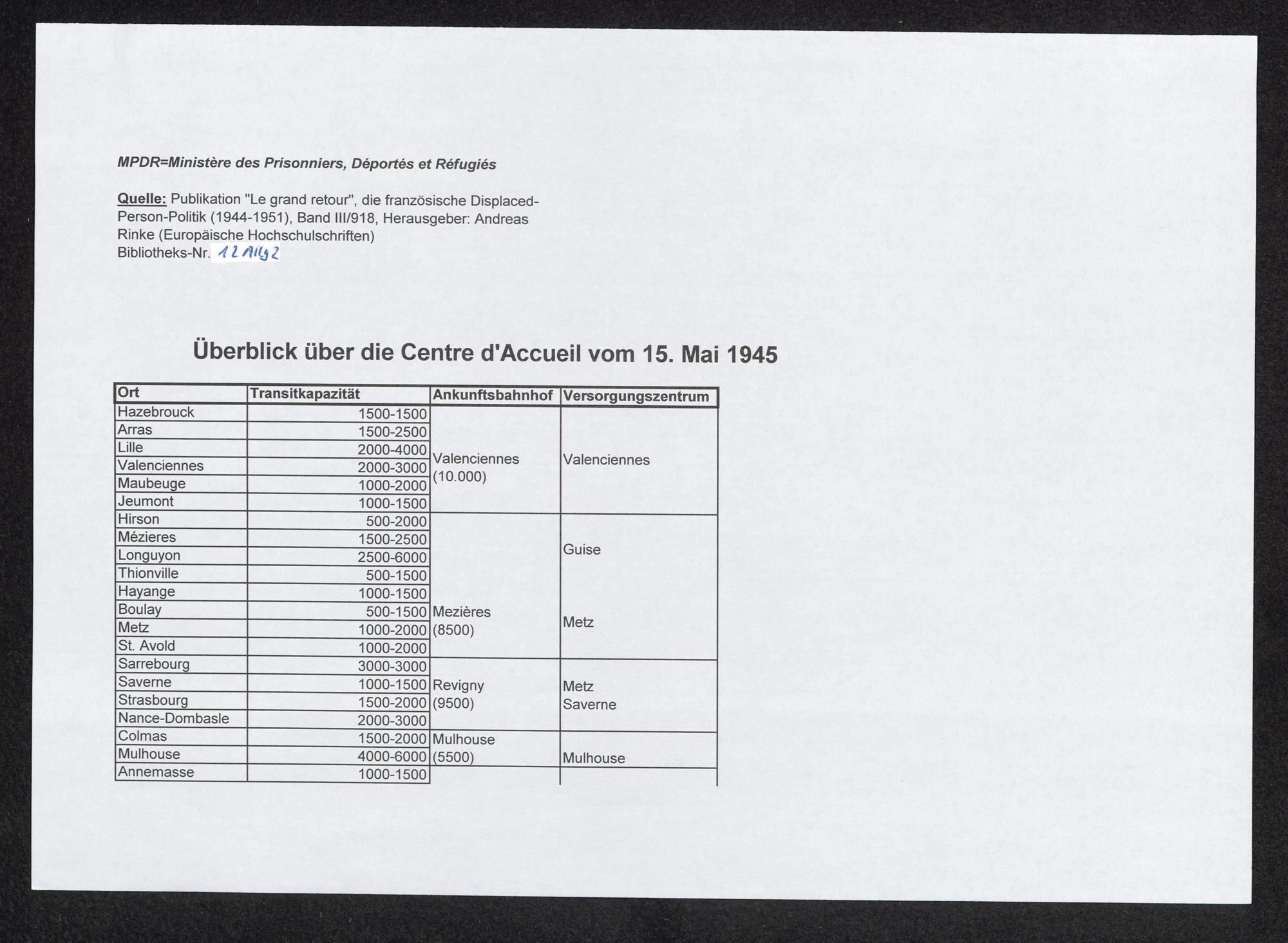 Verzeichnis MPDR-Lager für DP's in Frankreich, März 1945 / International Tracing Service