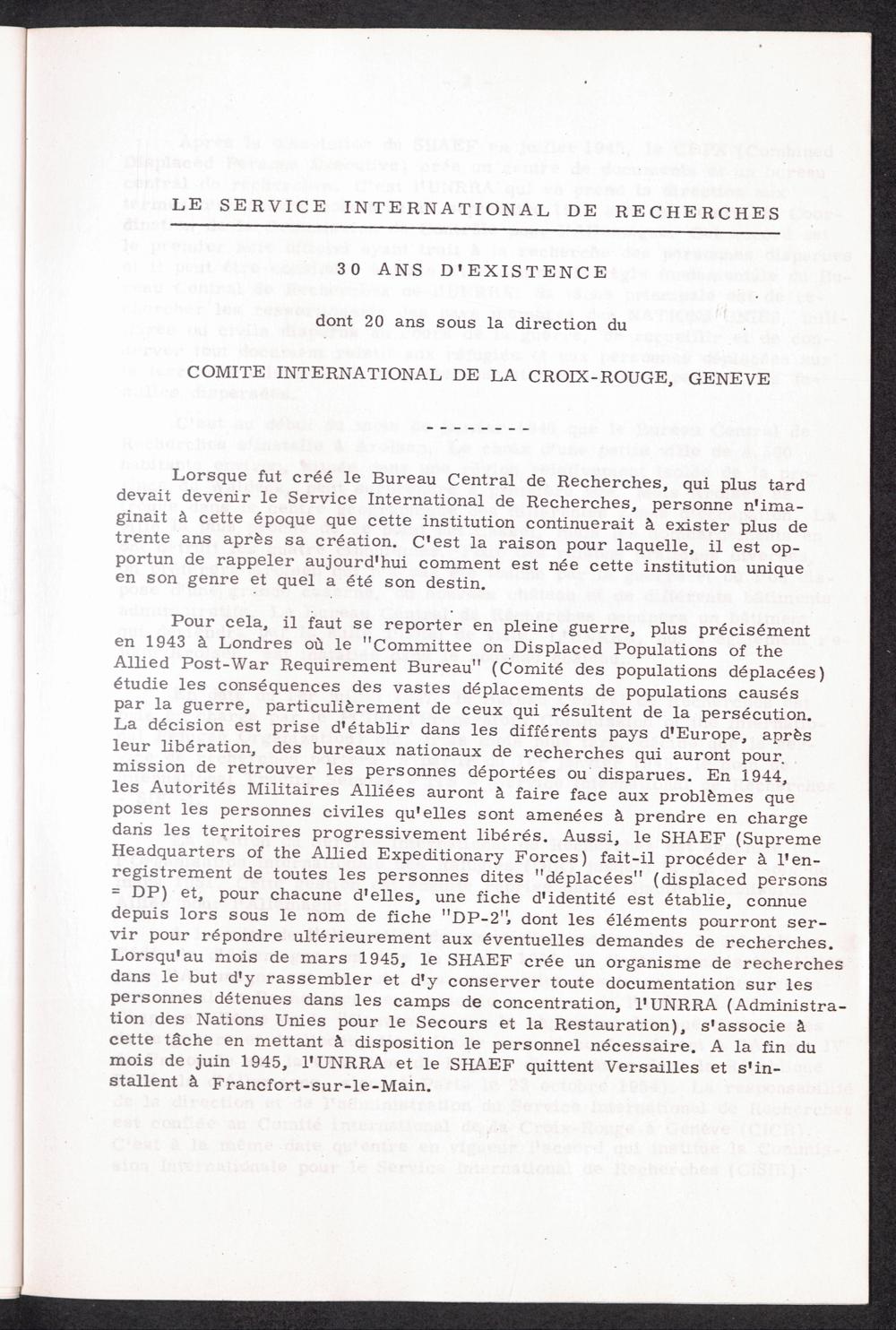 La Service International de Recherches : 30 Ans au Service de l'humanite dont 20 ans sous la direction du Comite International de la Croix-Rouge a Geneve / International Tracing Service