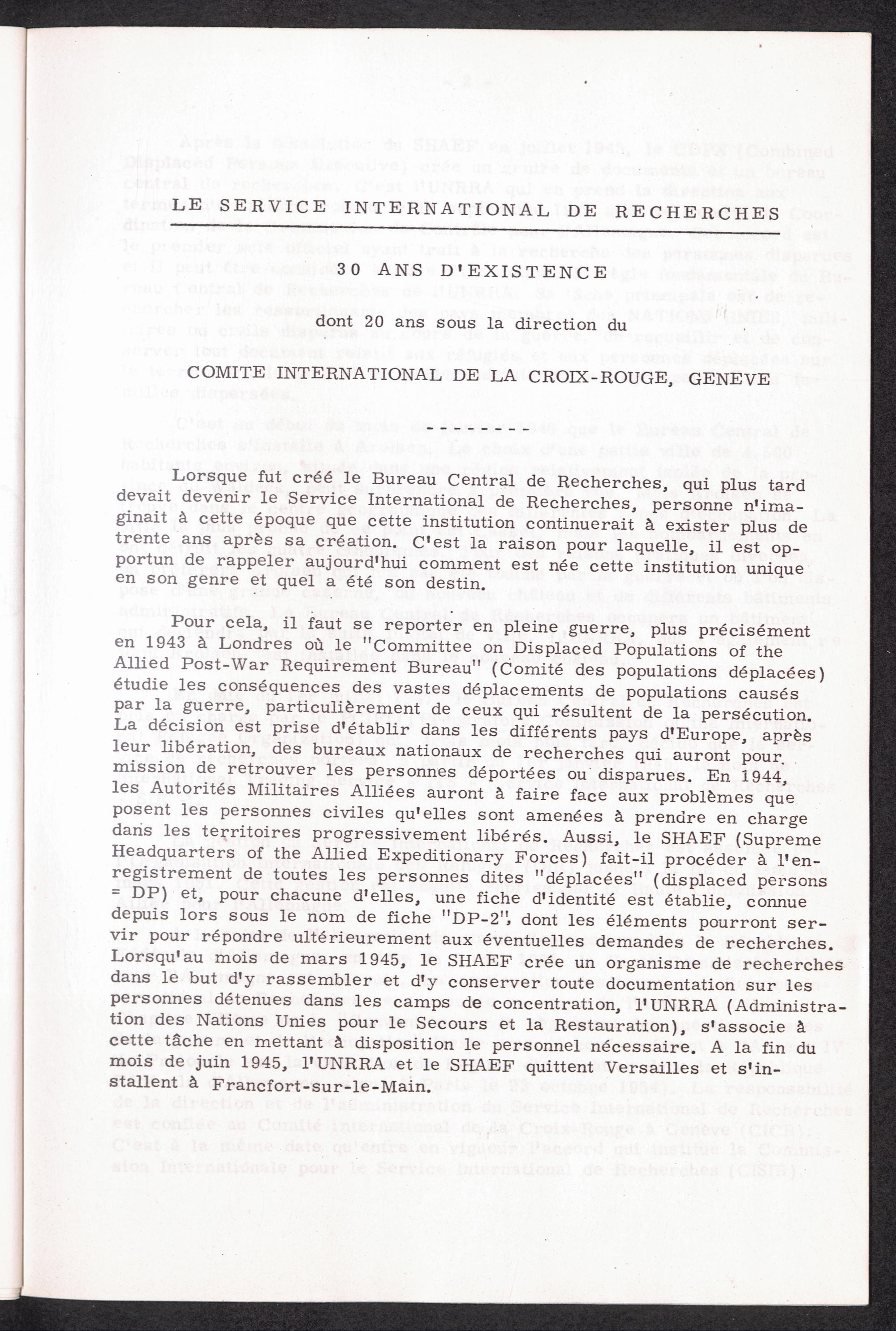 La Service International de Recherches 30 ans D'Existence dont 20 ans sous la direction du Comite International de la Croix-Rouge,...