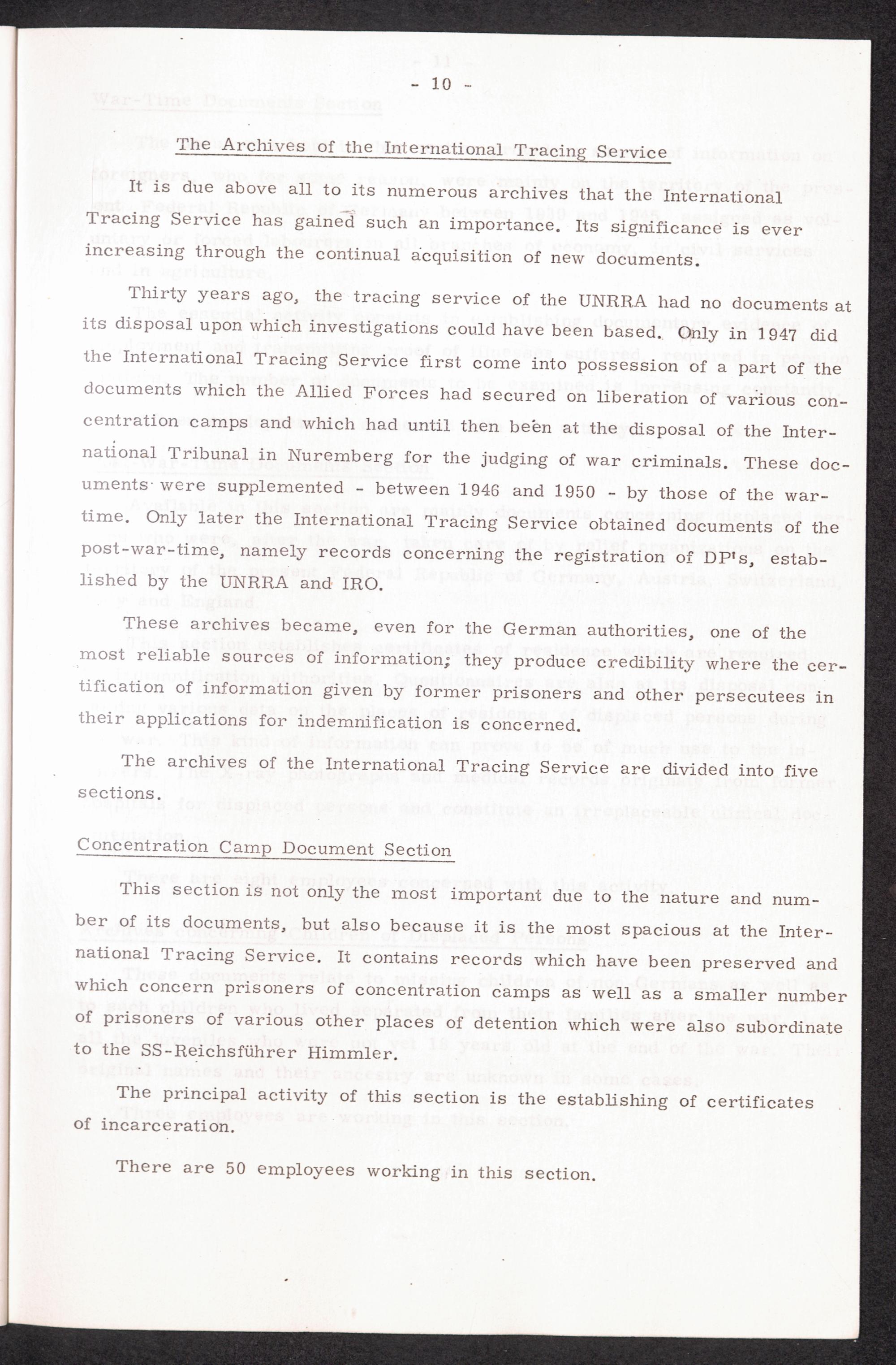 The International Tracing Service : Its origin, tasks and activities - 30 years in the service of humanity. Therof 20 years under the direction of the International Committe of the Red Cross in Geneva