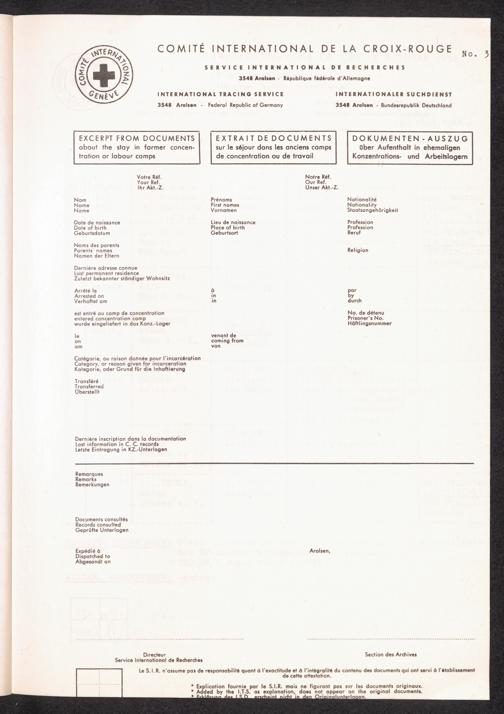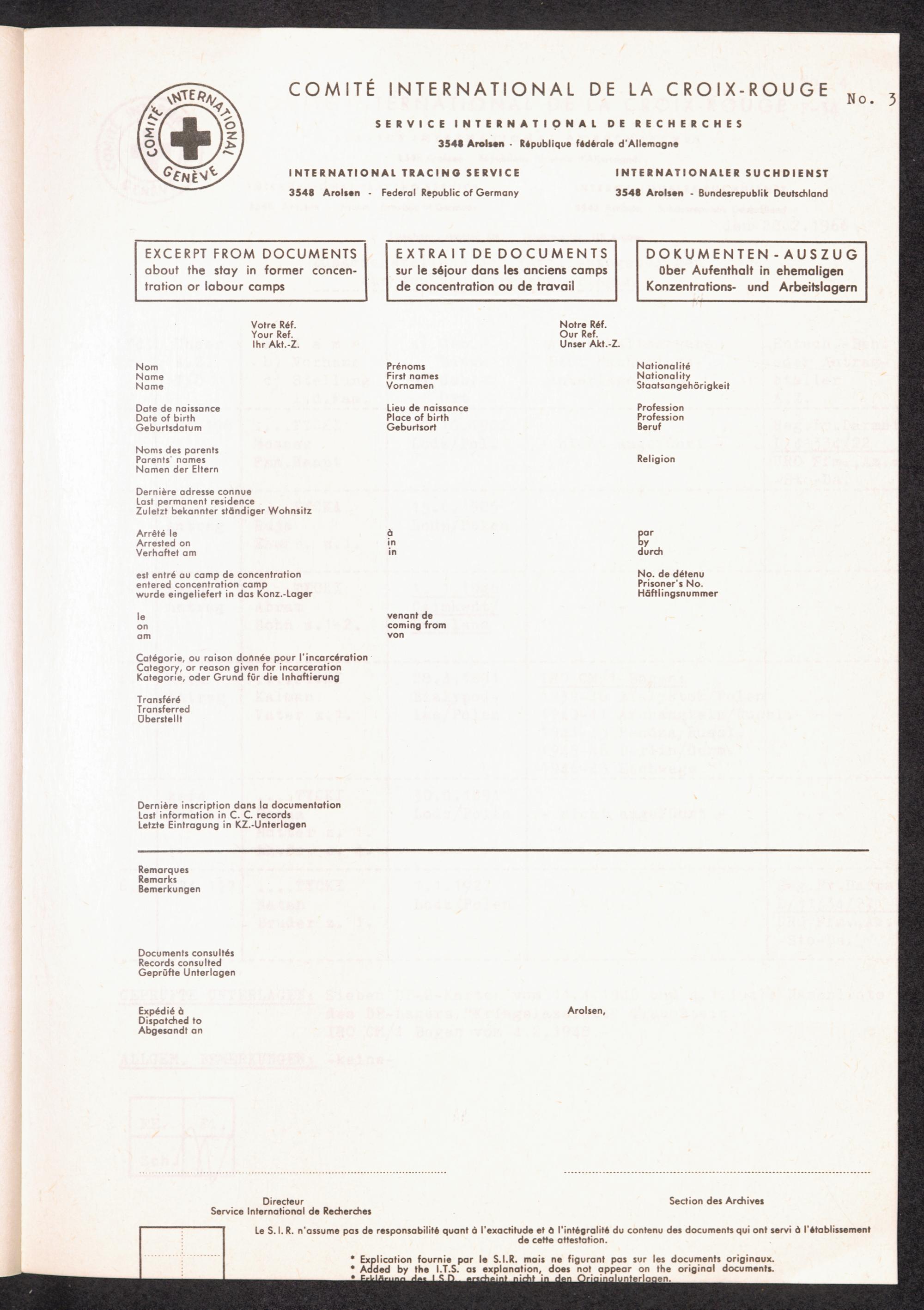 Le Service International de Recherches a Arolsen (1945-1965) No. 3 Dokumenten-Auszug (Beispiel)