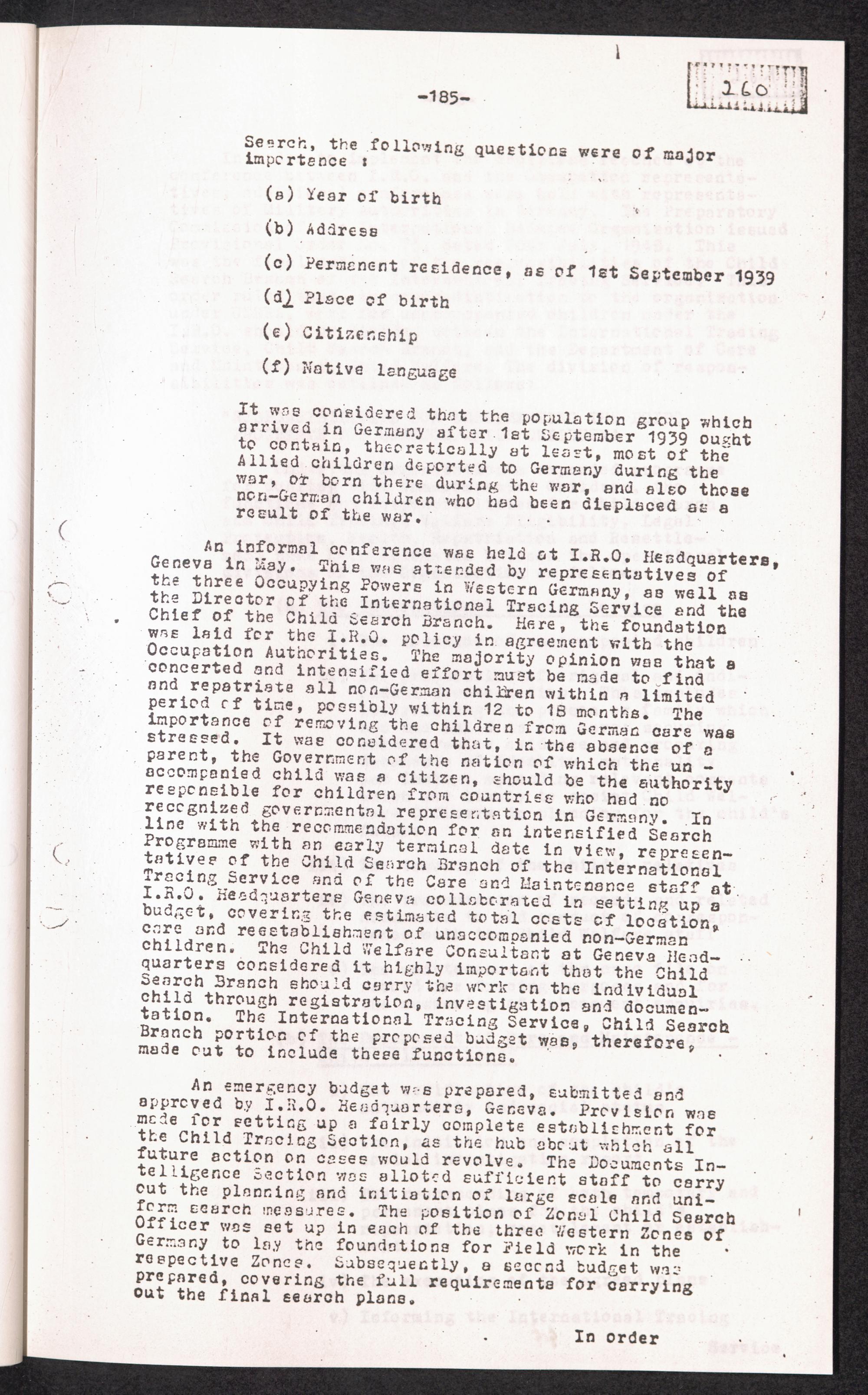 Historical Survey of Central Tracing Activity in Germany 1945 - 1951 Band 5. History of the Search for Unaccompanied Children History of the Search for unaccompanied Children Child Search Activities of the I.R.O.