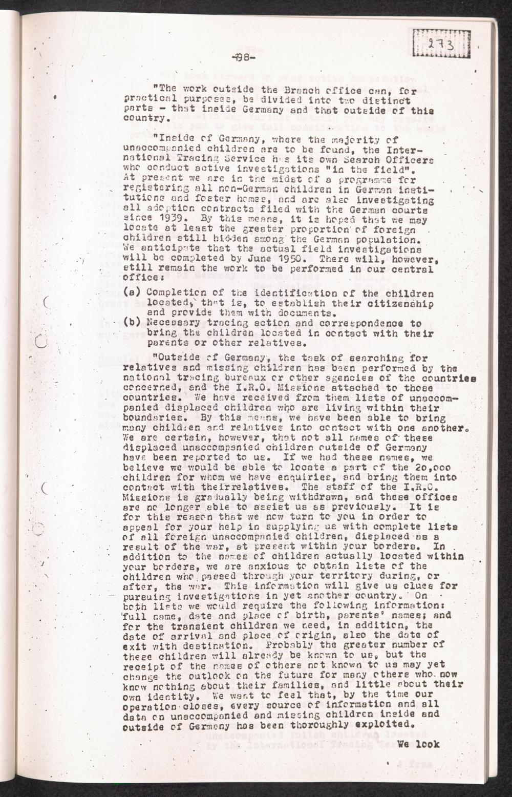 Historical Survey of Central Tracing Activity in Germany 1945 - 1951 Band 5. History of the Search for Unaccompanied Children History of the Search for unaccompanied Children Child Search Activities of the I.R.O.