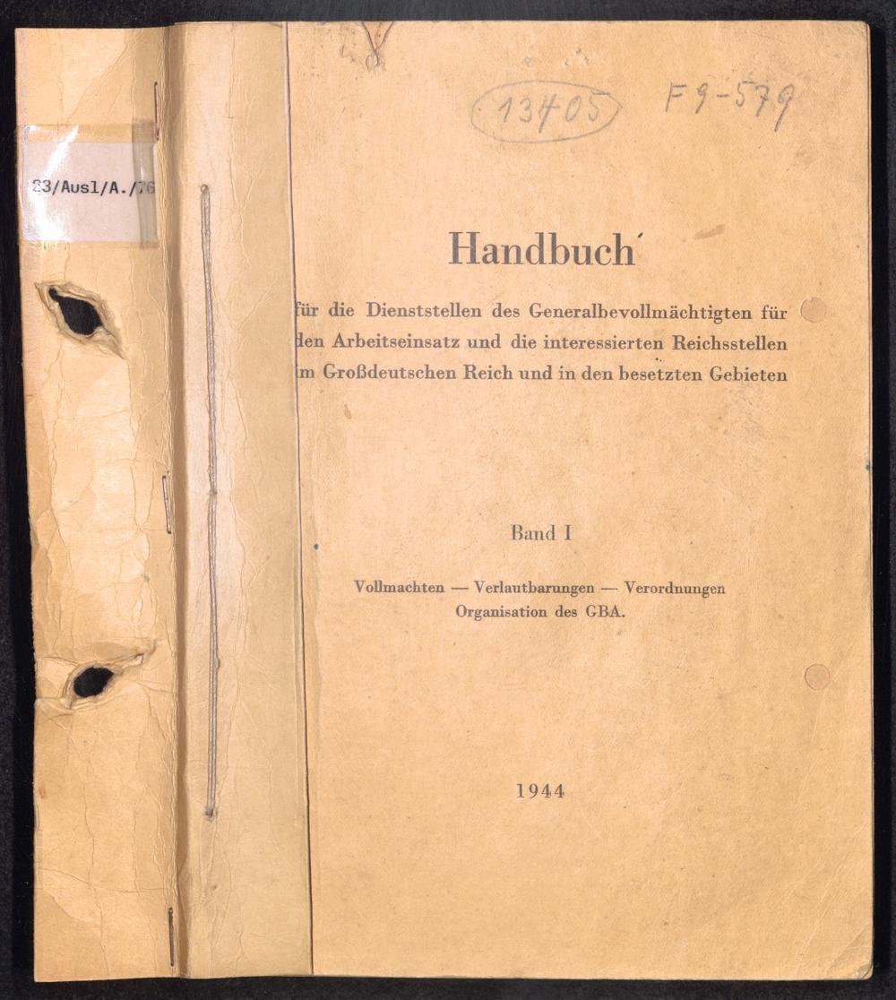 Handbuch für die Dienststellen des Generalbevollmächtigten für den Arbeitseinsatz und die interessierten Reichsstellen im Großdeutschen Reich und in den besetzten Gebieten : 1: Vollmachten - Verlautbarungen - Verordnungen - Organisation des GBA