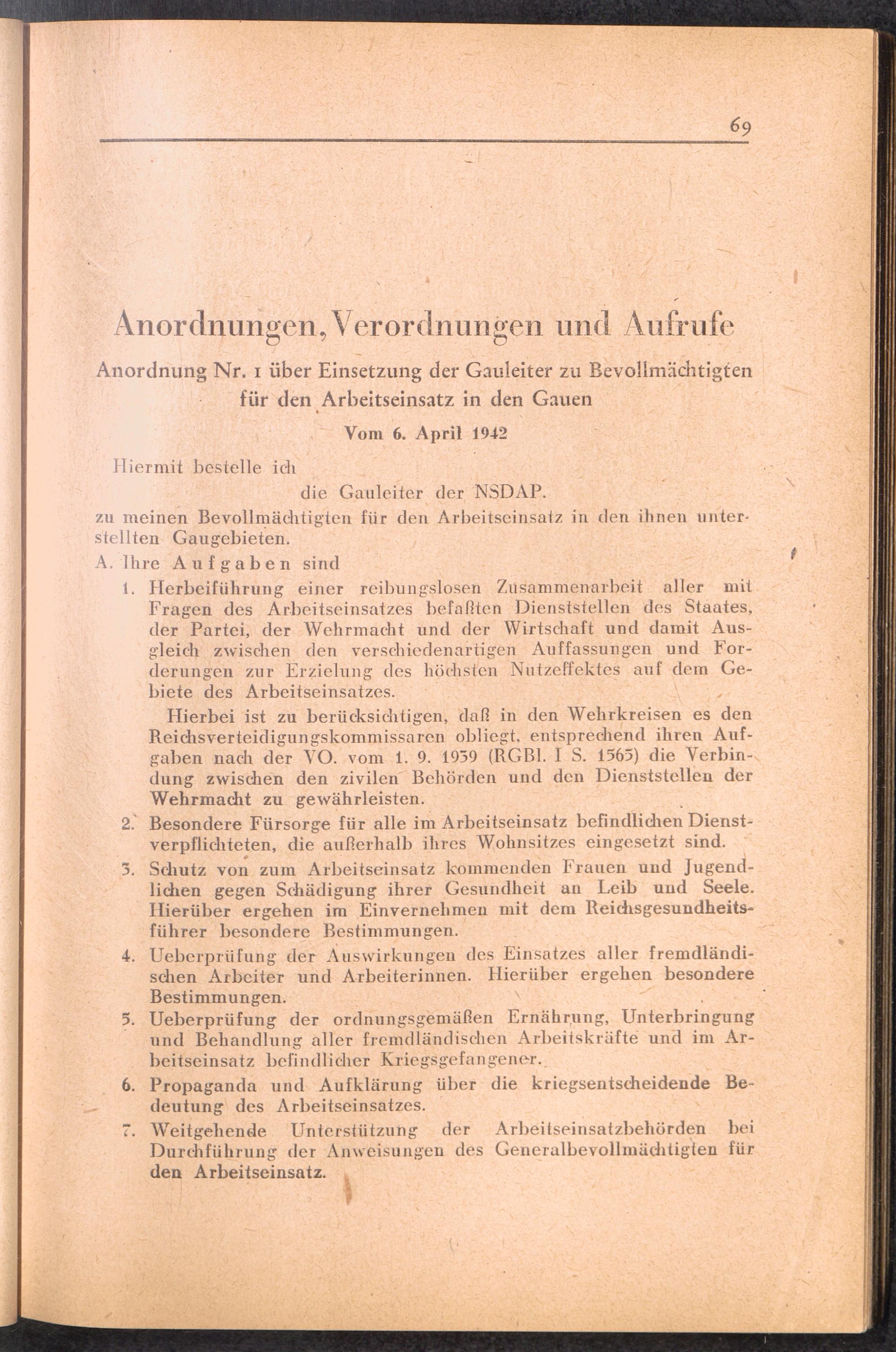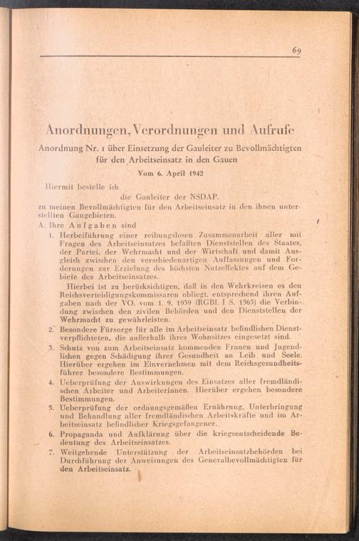 Handbuch für die Dienststellen des Generalbevollmächtigten für den Arbeitseinsatz und die interessierten Reichsstellen im Großdeutschen Reich und in den besetzten Gebieten : 1: Vollmachten - Verlautbarungen - Verordnungen - Organisation des GBA