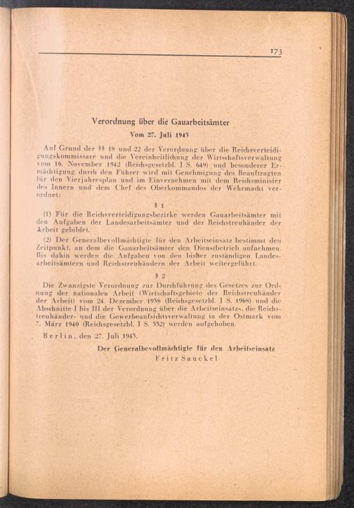 Handbuch für die Dienststellen des Generalbevollmächtigten für den Arbeitseinsatz und die interessierten Reichsstellen im Großdeutschen Reich und in den besetzten Gebieten : 1: Vollmachten - Verlautbarungen - Verordnungen - Organisation des GBA