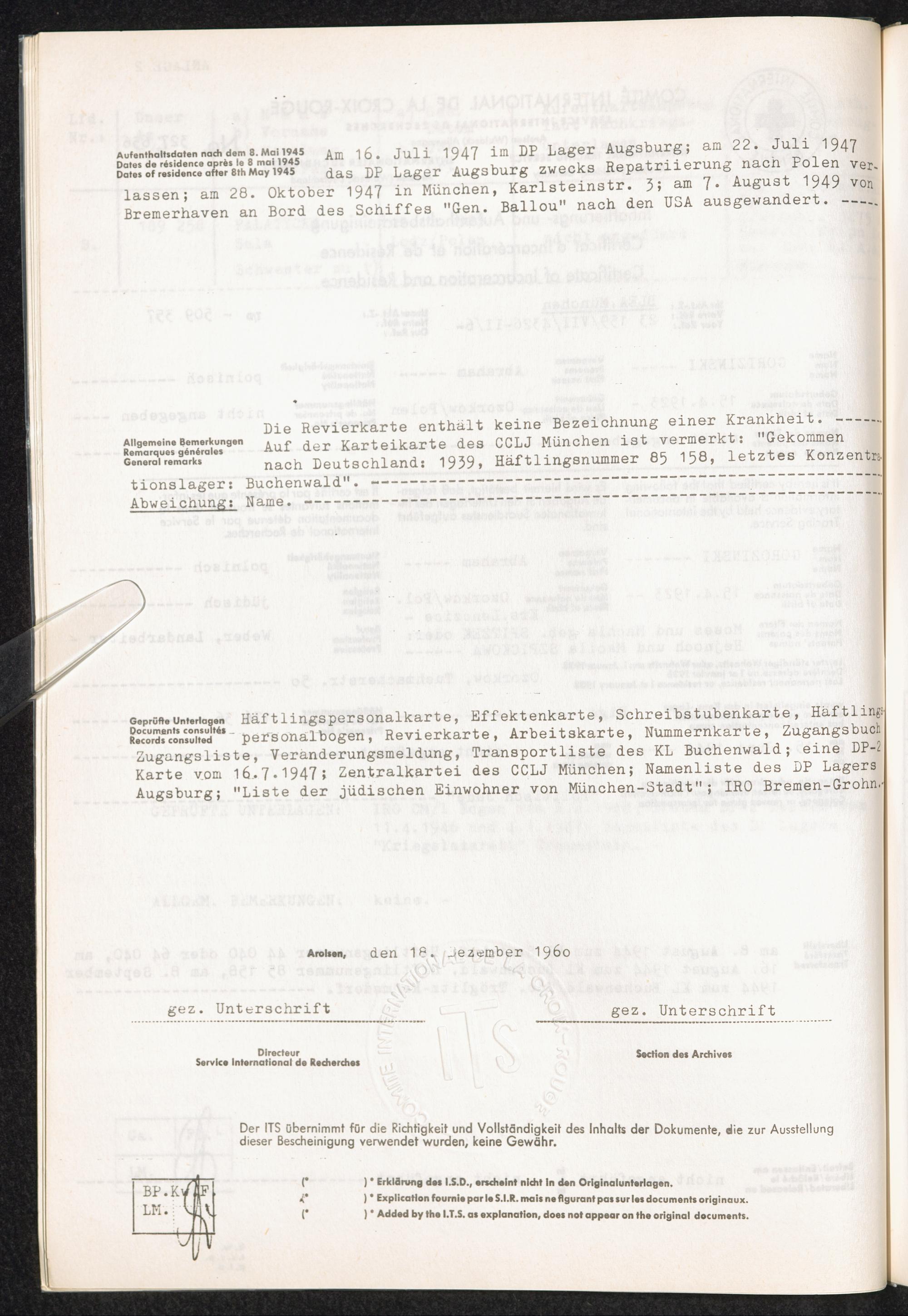 Der Internationale Suchdienst in Arolsen (1945 - 1964) Anlage 2: Inhaftierungs- und Aufenthaltsbescheinigung