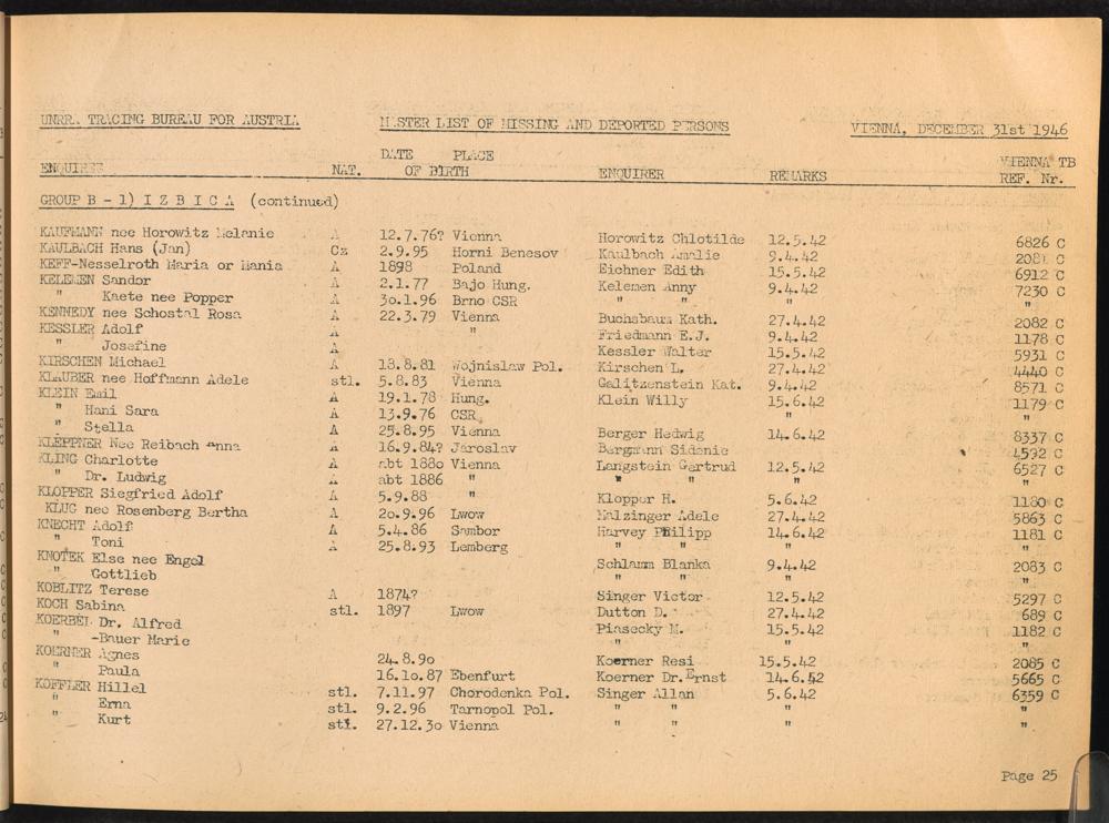 Master List of Concentration Camp Victims : Consisting of all people listed by this bureau as missing or deported / Tracing Bureau for Austria