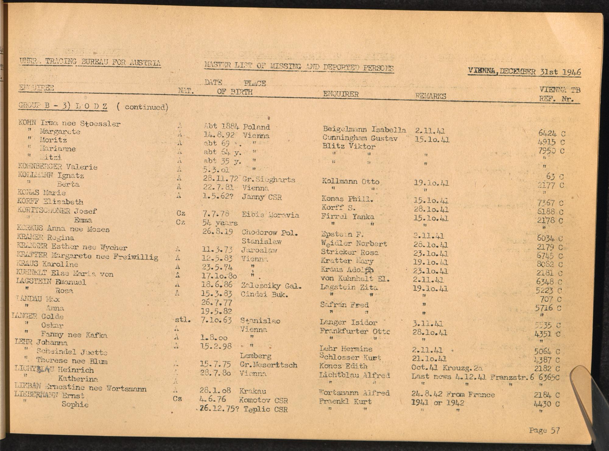Master List of Concentration Camp Victims : Consisting of all people listed by this bureau as missing or deported / Tracing Bureau for Austria