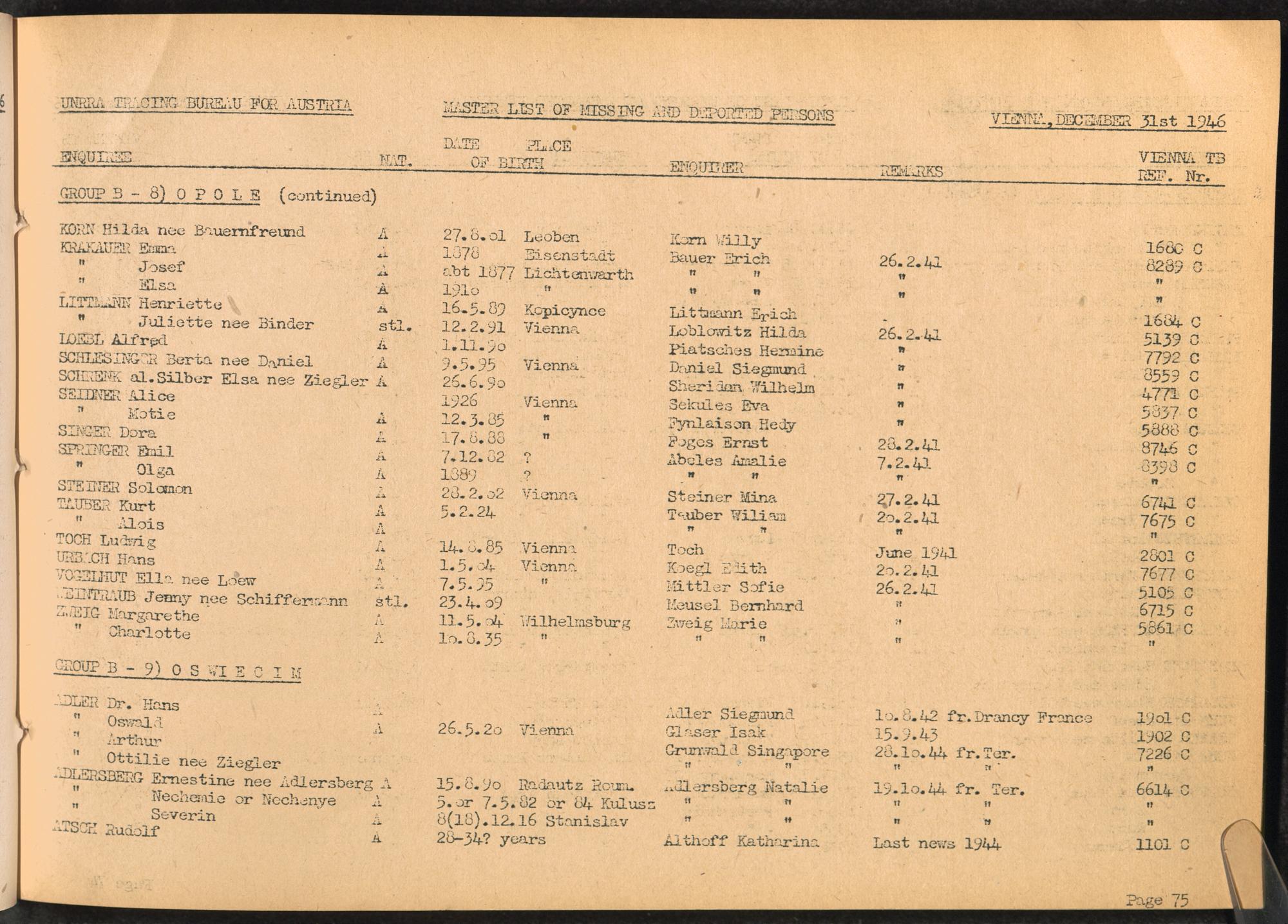 Master List of Concentration Camp Victims : Consisting of all people listed by this bureau as missing or deported / Tracing Bureau for Austria