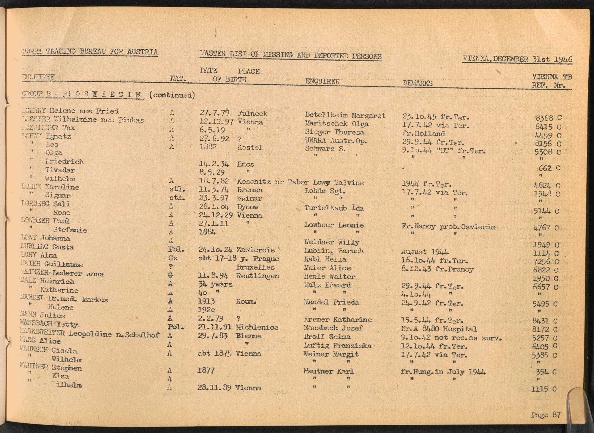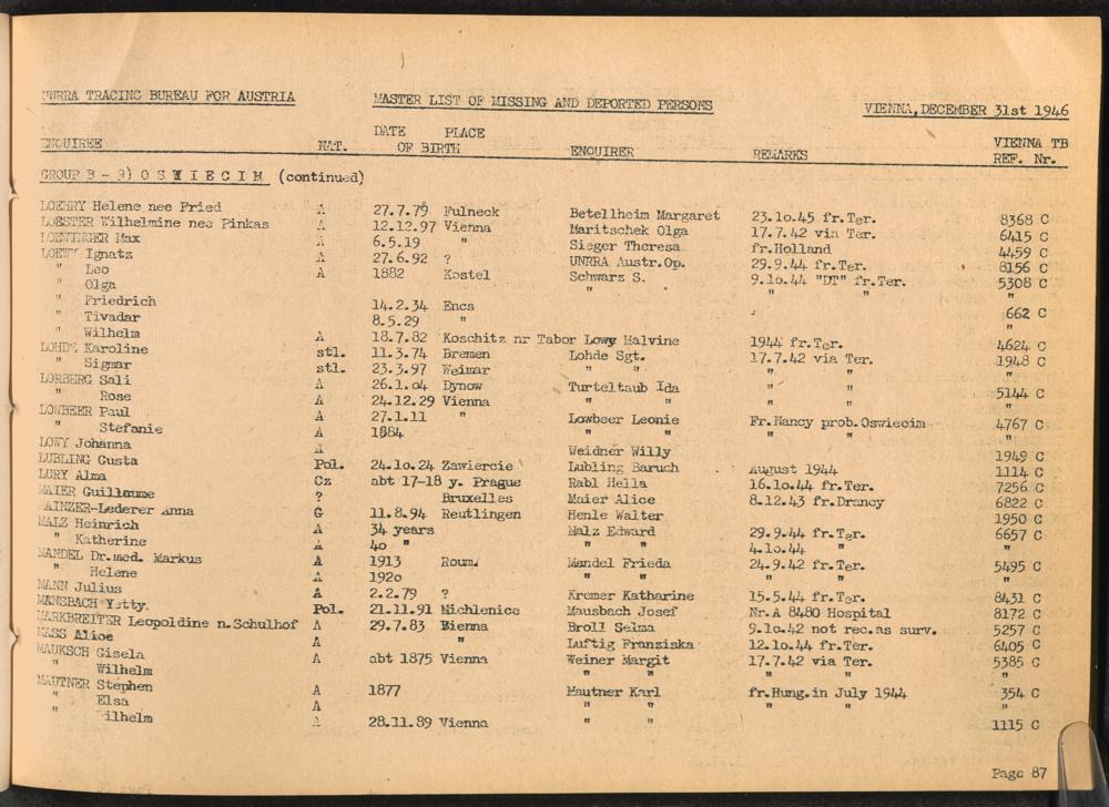 Master List of Concentration Camp Victims : Consisting of all people listed by this bureau as missing or deported / Tracing Bureau for Austria