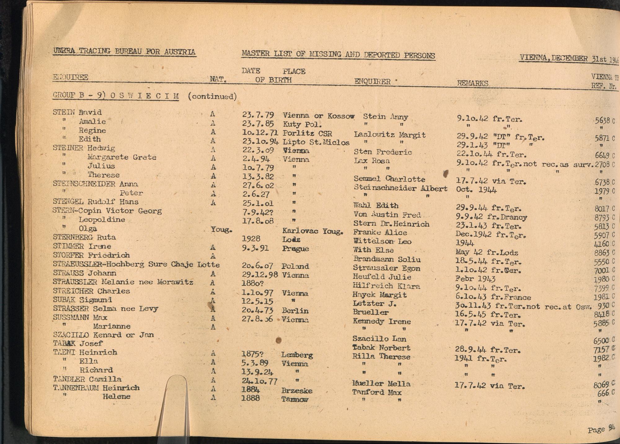 Master List of Concentration Camp Victims : Consisting of all people listed by this bureau as missing or deported / Tracing Bureau for Austria
