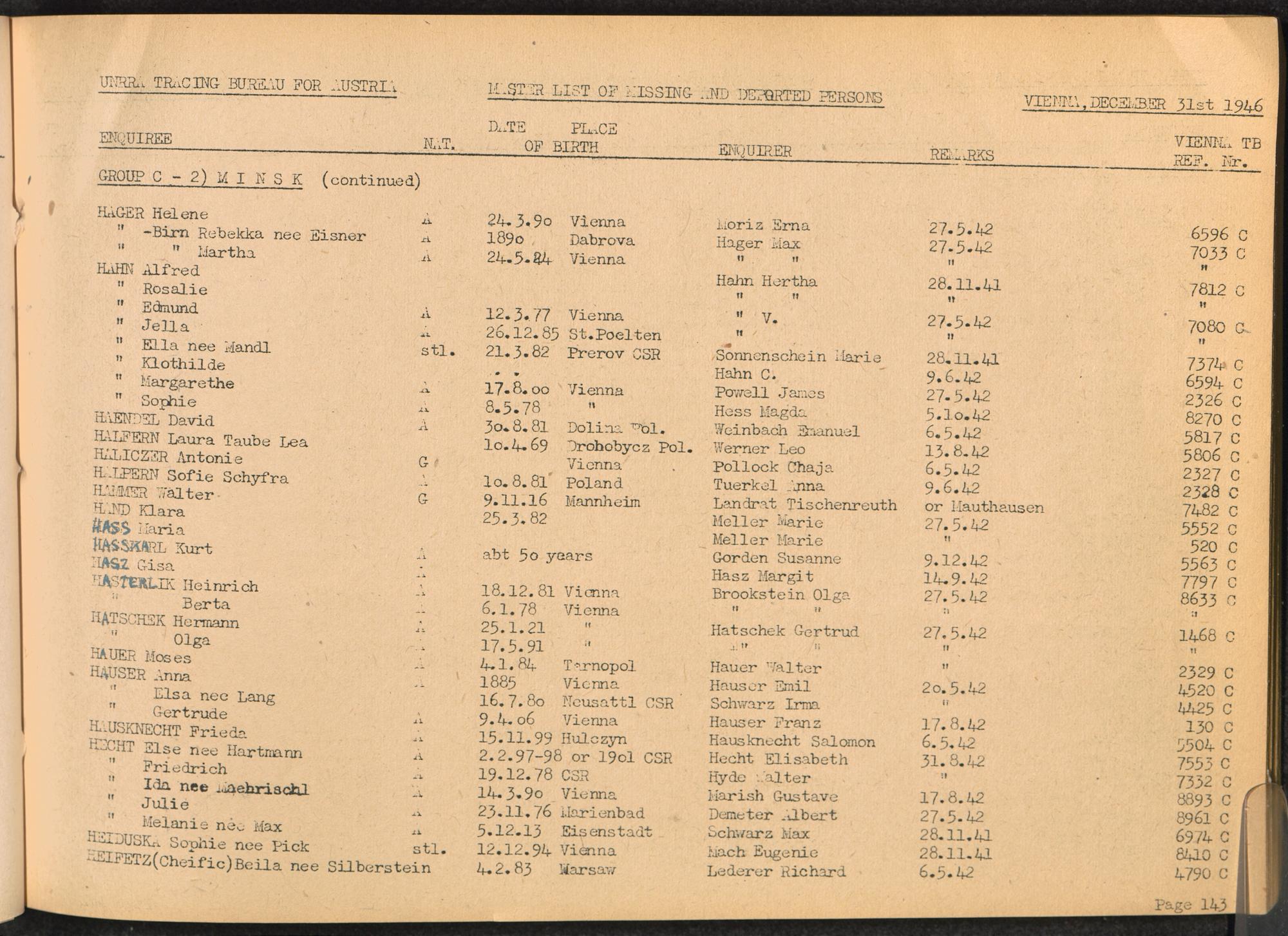 Master List of Concentration Camp Victims : Consisting of all people listed by this bureau as missing or deported / Tracing Bureau for Austria