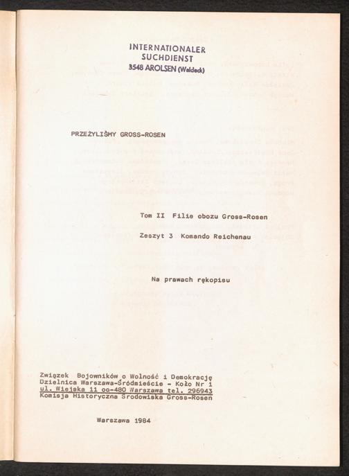 1984: Przezylismy Gross Rosen Tom II, Filie obozu kocentracyjnego Gross-Rosen, Zeszyt 3 : Kommando Reichenau