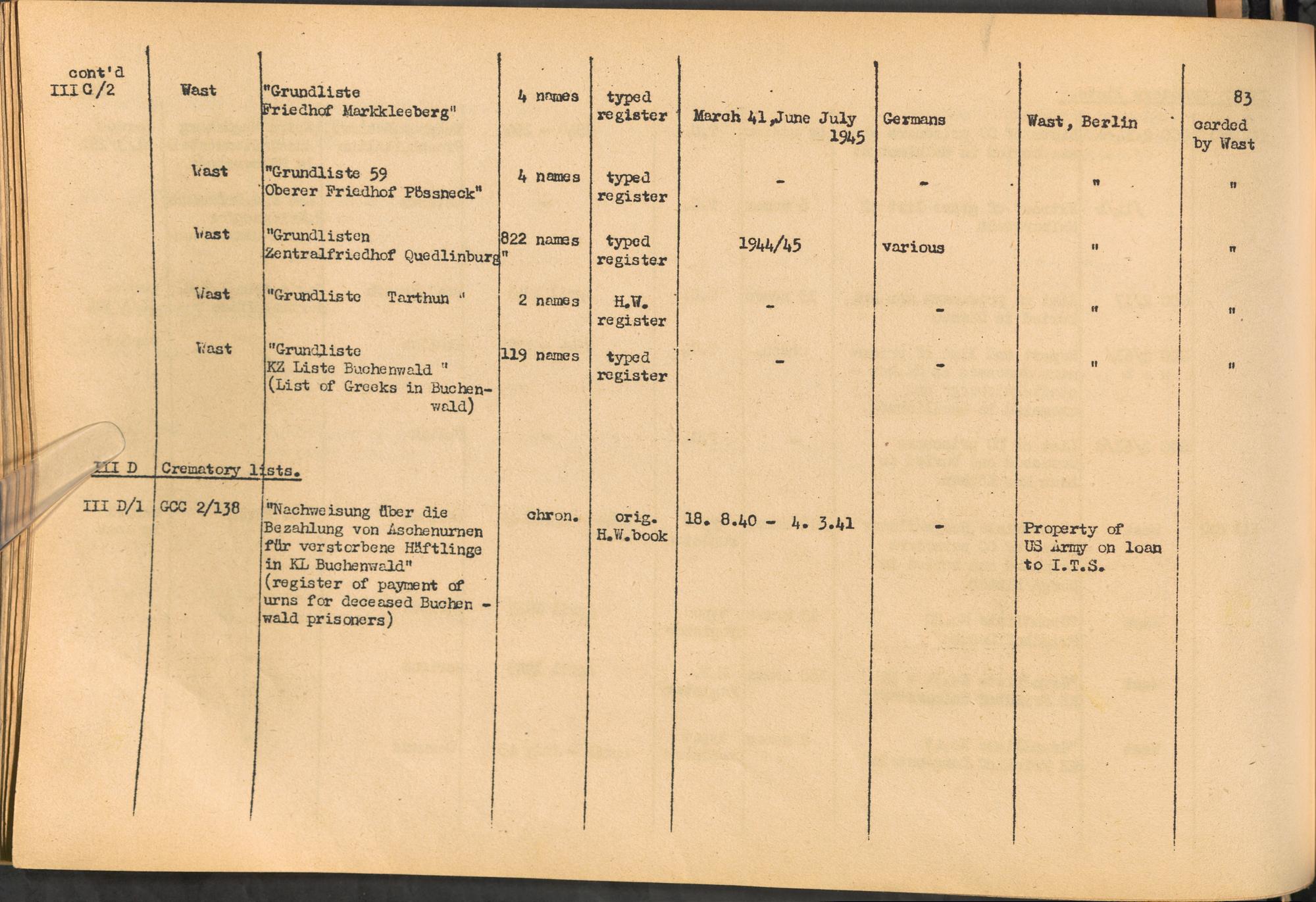 Band 1: Catalogue of Concentration Camp Records held by the International Tracing Service of the Allied High Commission for Germany, Volume I