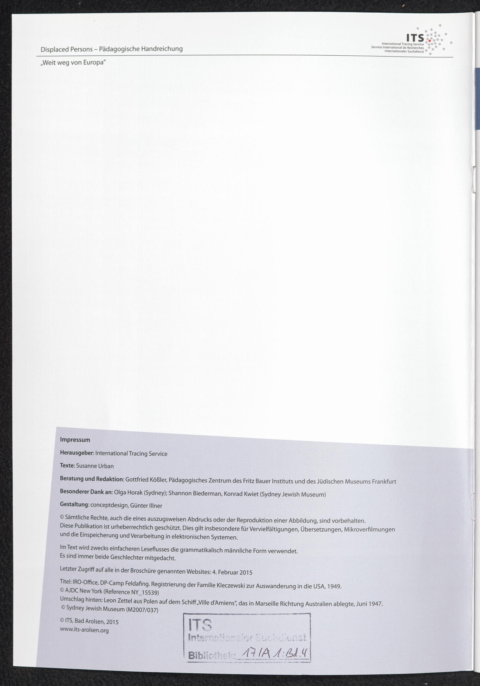 Pädagogische Handreichungen - Displaced Persons Heft 4. "Weit weg von Europa" oder "Das Leben in Australien war ganz anders" Impressum