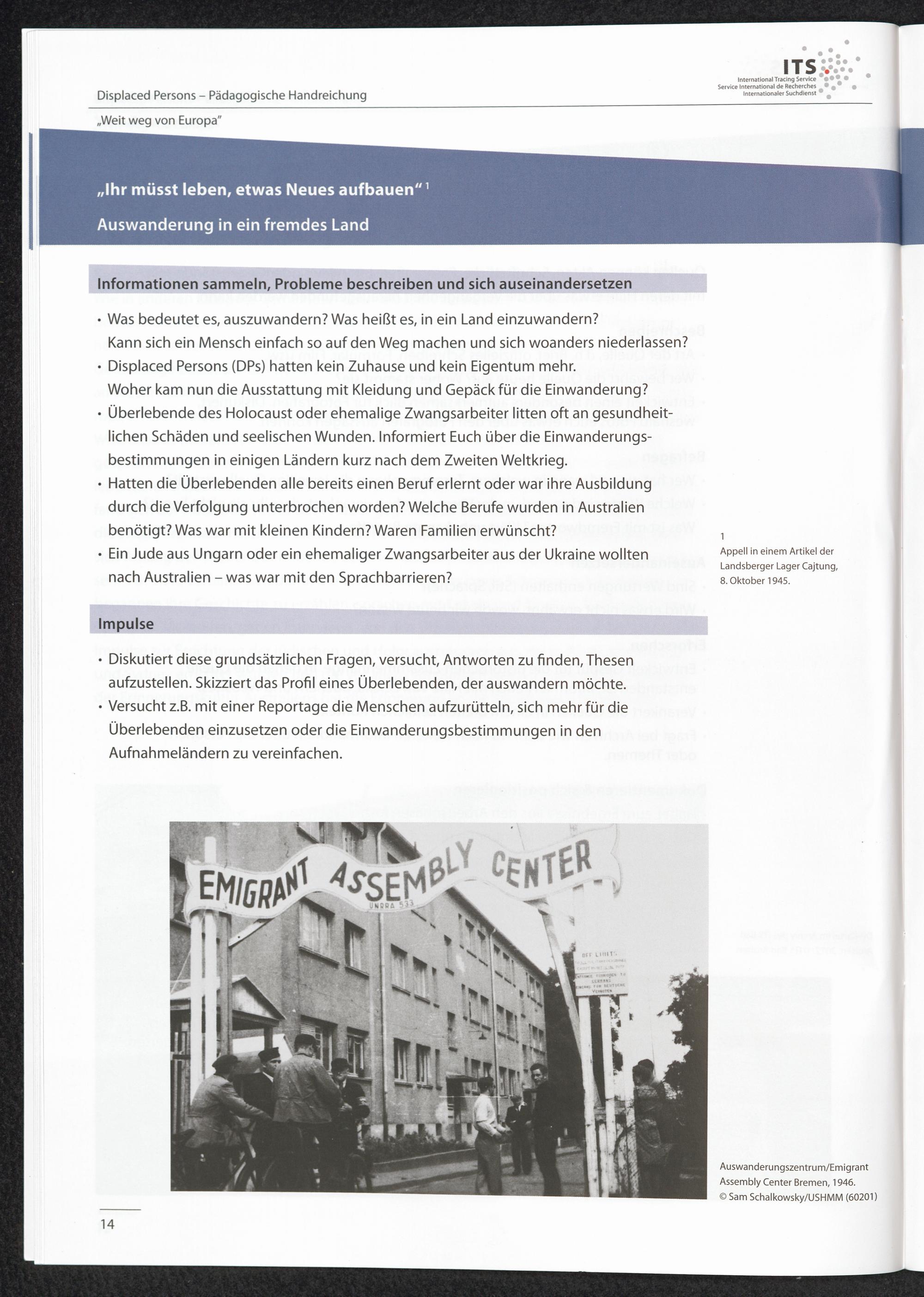 Pädagogische Handreichungen - Displaced Persons Heft 4. "Weit weg von Europa" oder "Das Leben in Australien war ganz anders" "Ihr müsst leben, etws Neues aufbauen": Auswanderung nach Australien